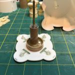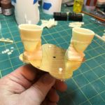 More progress has been made on the Saturn V build. I have removed all the raised detail from the aft skirt heat shield. That all had to go in order to install the brass part from New-Ware. The brass part is very nice and has much better detail that what was on the original piece. After removing the raised detail I got to thinking about how I was going to mount the model on its wooden base. I have used steel rod in the past and that works well. All I have to do is figure out how to accommodate the rod in the base of the model. I am using 1/8 in brass tubing and that will slide over the steel rod that is in the base. I used some paper tubes and epoxy to cover the hole where the center engine will be mounted. After epoxying the tubes in place and filling them with epoxy, I drilled an 1/8 in hole from the center engine through the tube and out the top of the aft skirt part. I then used JB Weld and put the 1/8 in brass in the drilled hole and about 3/16 in out the bottom. The extra out the bottom will aid in mounting the center engine.