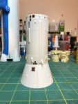 I test fitted the RealSpace SLA/CSM resin part to the Mongram S-IVB. I immediately noticed that there was a fit mismatch. The SLA was too small compared to the Instrument Unit on the S-IVB. I masked off the molded in stringers of the forward skirt and then used a sanding stick to sand the IU down to a smaller diameter that would match the SLA.