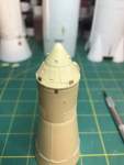 I then got ready to add the PE parts to the spacecraft section. My drawings show that after Apollo 14 there was an extra window in the BPC above the commander’s docking window. I took a small drill and made an appropriate sized hole. I’ll paint both the windows black when it comes time to paint.