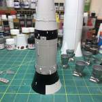 I started by masking the S-IVB and S-IVB interstage. I’m not going to mask all the small antennas on the IU. I’ll paint them individually after the black goes on. The S-IVB interstage has a couple of sections of black/white that are divided by a horizontal line. I’m using Tamiya flexible tape for that. It can follow a gentle curve without making creases in the tape.
