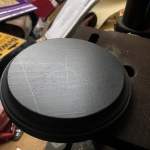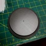 I sanded the wooden base block and sprayed it with gray primer. Then after that had cured, I drew three chord lines on it. Then I drew a perpendicular bisector for each of those chords. Where the bisectors intersect is the center of the circle. You can see that my bisectors were just a bit off, but since I drew three, I could average the difference and come out with a hole that was pretty close to the center.