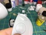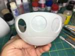 Next came masking of the command sphere halves. The lower half only needed to have its glue tab masked to give a better bonding surface later on. The upper half needed to also have its glue tab masked, but also the cockpit window opening.