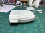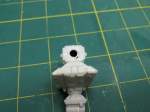 Next I moved on to the back of the command sphere and the reactor/engine section. First I took the back of the command sphere and drilled a hole to allow the wires to pass from the sphere, through the spine back to the reactor section where the batteries and switch will be. I made sure that the hole is not so large that the tube will pass through. I then moved on to the forward neck section. I left it in three pieces to make painting easier.