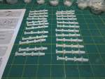 With the main sections complete, the next thing up is the extremely repetitious spine and cargo pods. I’ve got them removed from their runners and organized in numbered cups. I still need to clean up the edges and then start putting them all together. Hopefully I can get them done soon since next week’s weather is favorable for painting.