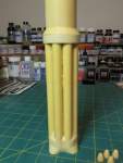 I sanded the bases of the major sections and then started stacking them to see how far off from square I was. It is really difficult to sand them exactly square, so I rotated the parts until I got what looked like a straight rocket from the bottom to the top. I also made some alignment marks so that as I stack them later for gluing I can be sure that the alignment remains in the original orientation.