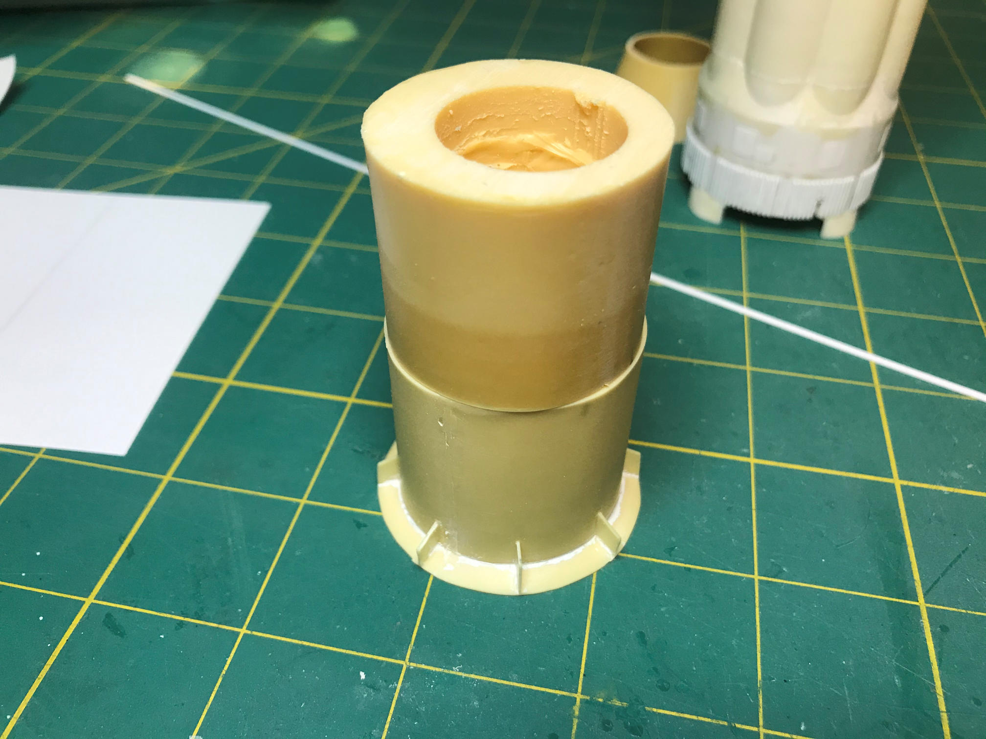 Speaking of not letting things go, I also removed the fairings from the base of the S-I stage. They were just too clunky with the blocky attachment points. So I removed them and will glue them back on after trimming all the excess plastic off. This also allows me to move the heat shield down to the bottom of the S-I instead of being slightly recessed.