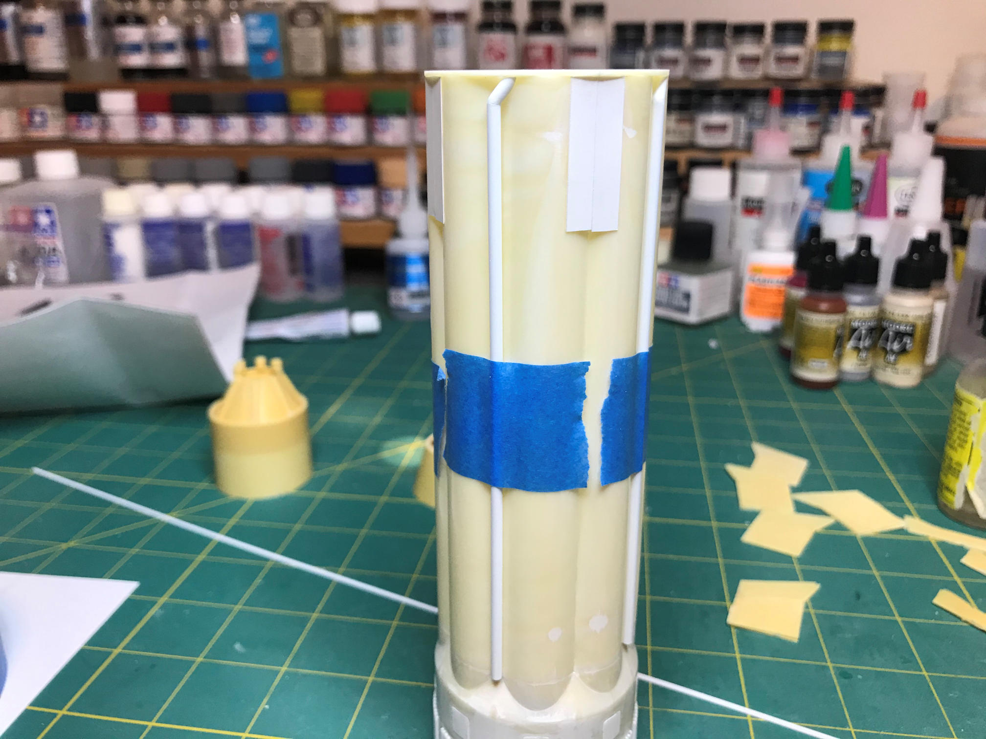 Back to work on the SA-5 model a bit. Work continues on the S-I first stage. I got the puttying and trimming on the tanks done and they should be pretty smooth. I scratch built the gaseous hydrogen vent pipes that go down the first stage at three points. There was plastic rod included in the conversion kit but they did not include the bend at the top that was required to make the pipes meet their counterparts from the S-IV second stage. I had some Evergreen plastic tubes that were a close match to the diameter supplied in the conversion kit. I cut them to length and then cut a small section from the top at around a 30 degree angle. Then I rotated it and glued it back on the tubing. Then I needed to trim the back side of the angled section since the Airfix kit does not provide enough room. I then taped them to the side of the S-I to see how they looked. I think they will be fine.