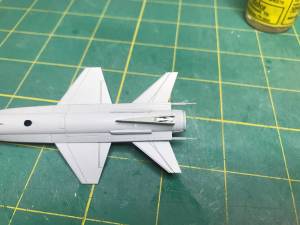 I then turned my attention to the air brakes. The opening in the installed kit part ends far too soon. Not a problem with the rudder attached, but with the rudder gone you can easily see that the air brake vanes appear too short. I remedied this by carving more of the part off until I had a depth that I could live with. Then I laid the piston in place and noted where to trim the small rod. I angled the back of the larger rod to match the carving that I had done and trimmed the small rod to the proper length and slightly thinned it where it would attach to the air brake actuator hub. It was all glued in with some Tenax 7R.