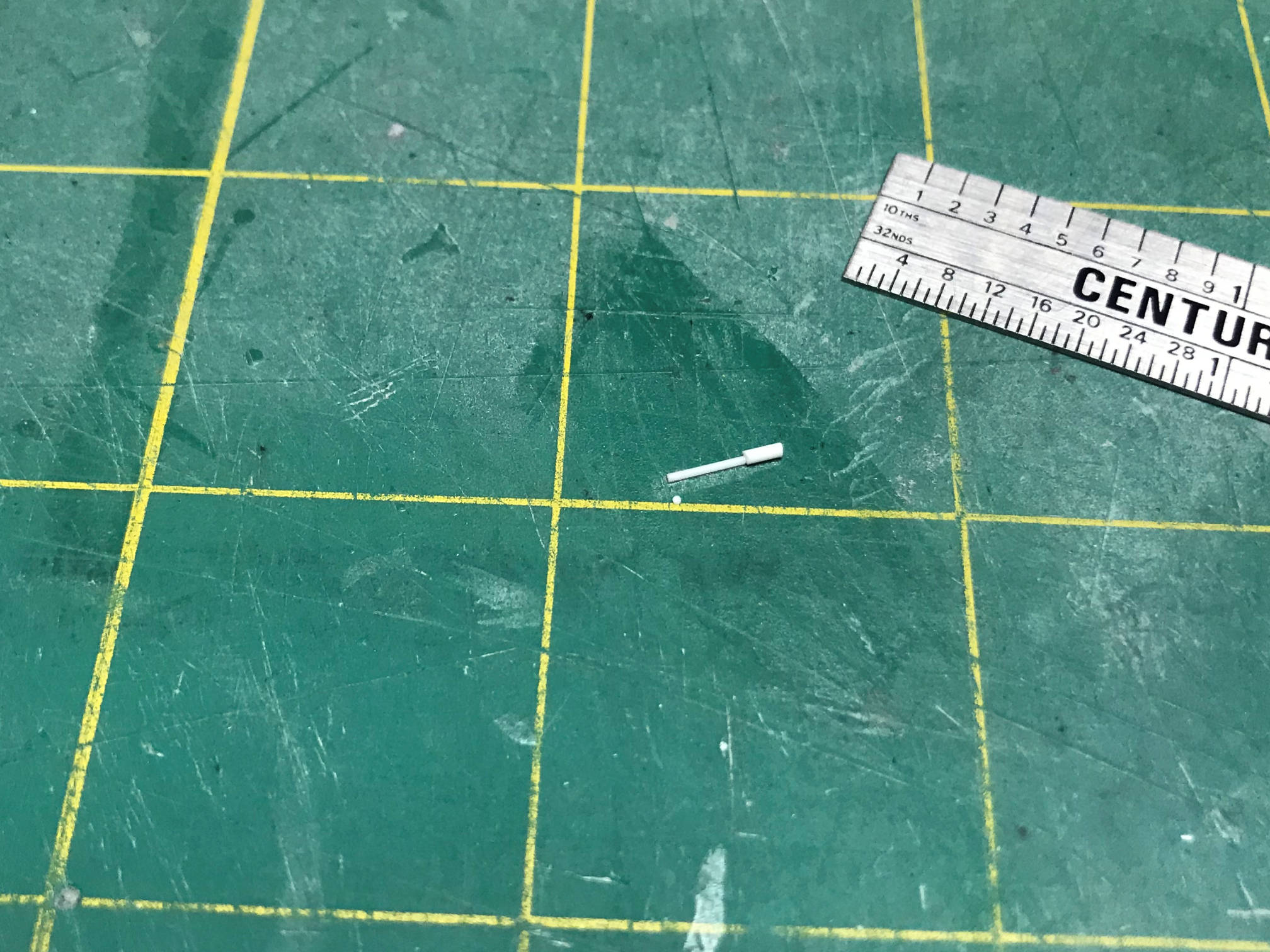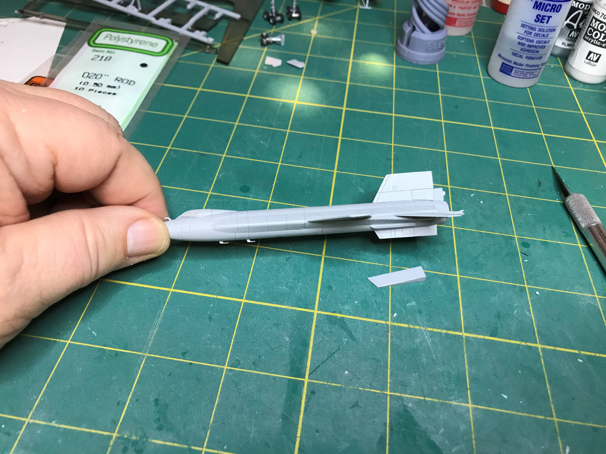 Now the air brake actuator that was originally mostly hidden was exposed for all to see. This means that I need to add some more details. I did a bit of extra sculpting on the installed actuator to clean it up a bit. I then started on scratch building a main hydraulic piston. I used the same diameter styrene rods that I used on X-15-1. I made the small rod longer than necessary and I’ll trim it off after fitting it.