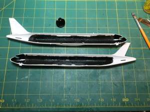 In the meantime I was searching online for photos of the JAL plane so I could try and get the paint scheme right. The only thing I needed to change were the engine nacelles. JAL painted the engine cowling white while ANA used gray. The pylons on both liveries were gray. I masked off the gray areas of the engines and painted the cowlings white. I had to repaint the leading edge of the cowlings silver since I really couldn’t mask them very well.
