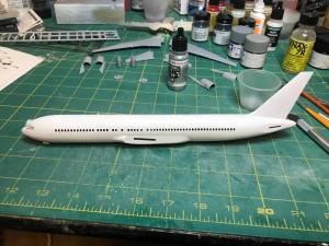 Here is the fuselage with a couple of coats of white primer. Note how the cabin windows show as black due to the black that was painted on the inside.