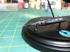 I then placed the models on the base. There is a short rod that keeps X-15-1 from slipping off the base. The angled rod is for the X-15-3 which I’m displaying in flight. Here are a couple of shots of the planes on the stand.