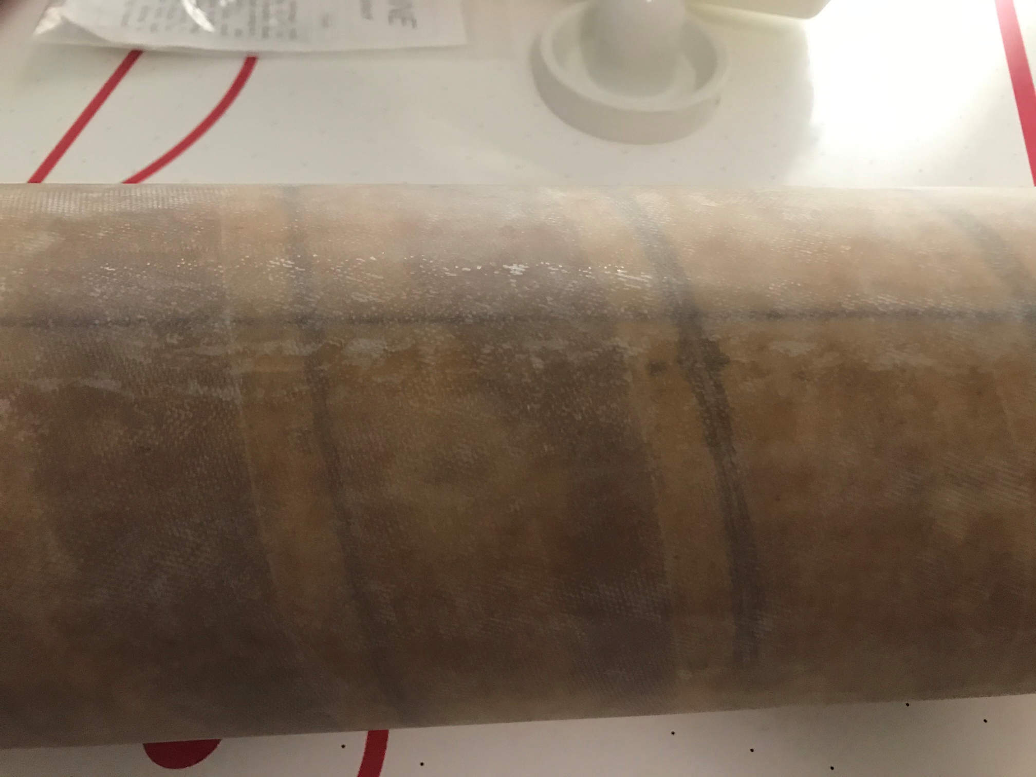 I did have a spot on one end of the tube where one layer of the fiberglass lamination did not stick and got sanded off. The first layer was still well attached to the tube so I just needed to patch the one layer. I mixed some 30 minute epoxy and spread it into the divot. Then I took a strip of blue painters tape to get the epoxy to lay smooth and avoid a bunch of sanding. After it set I removed the tape. I gave it a day to completely cure and then sanded it smooth. The below picture shows the edge where the patch is. You can hardly tell it is there.