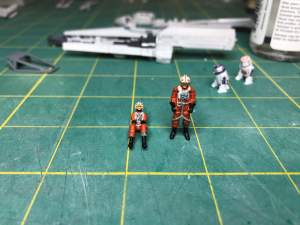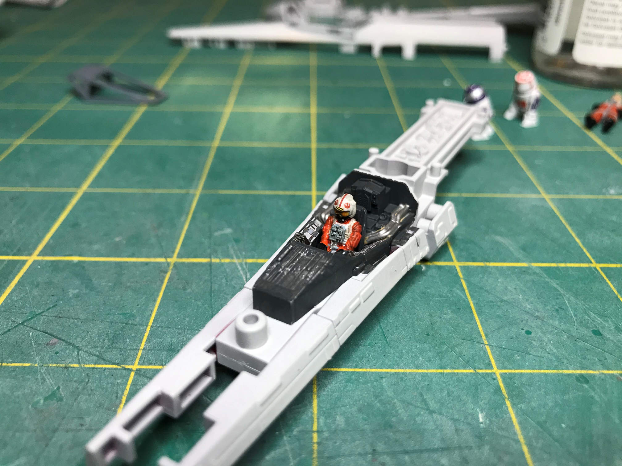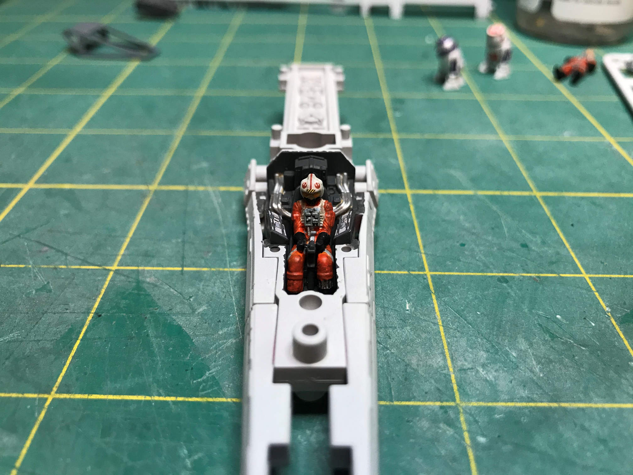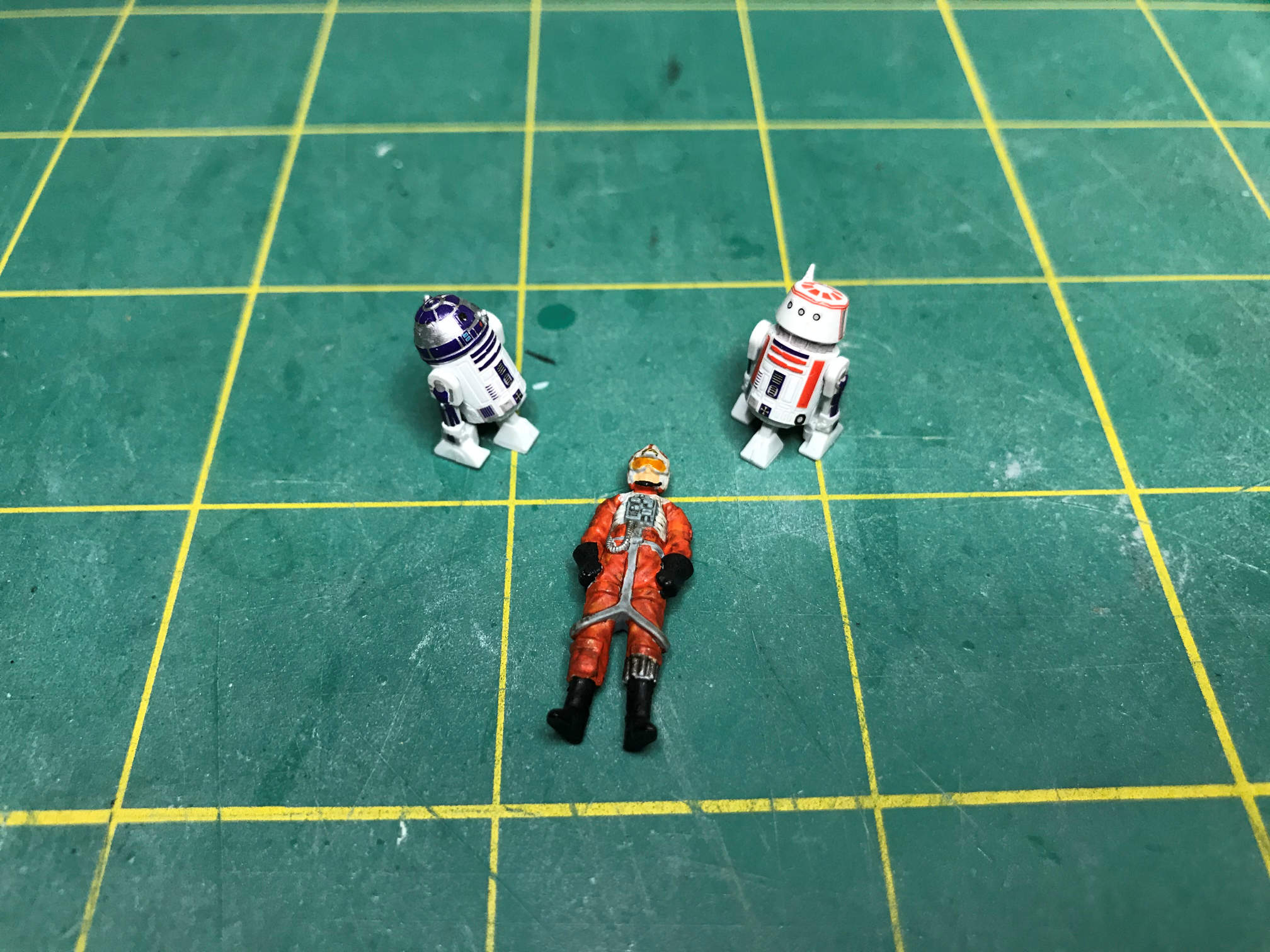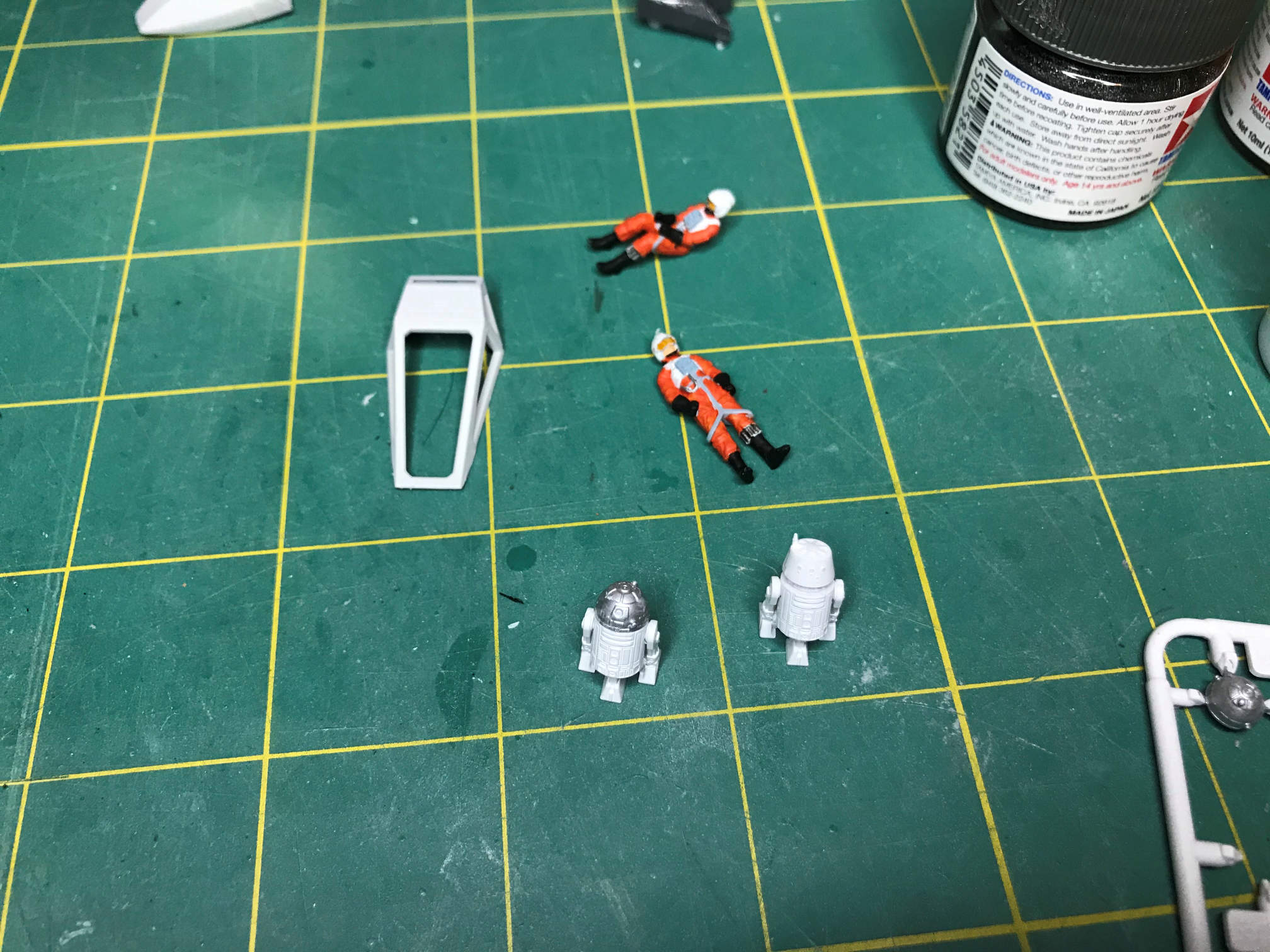I decided to start with the figures first. I assembled both R2-D2 and R2-D4. R2-D2 got his dome painted silver before assembly. The pilot figures were painted with black, orange, white, aged white, flesh, gray, and transparent orange. The droids (other than R2-D2’s dome) were painted white.
