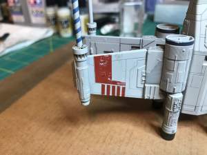 The decals went down without too much trouble. There were a couple of areas of raised detail that required a bit more work, but they ended up snuggling down nicely. The two laser cannons that had the blue barber pole markings surprised me with how well the decals went on. They were exactly the right width to go around the barrels and met at the edges perfectly. The yellow area around the upper left hand engine is not the decal included with the kit. I could tell the decal for the raised detail of that part was never going to work well so I painted it yellow instead. The masking was simple so I didn’t have a problem with keeping the yellow where it was supposed to be.
