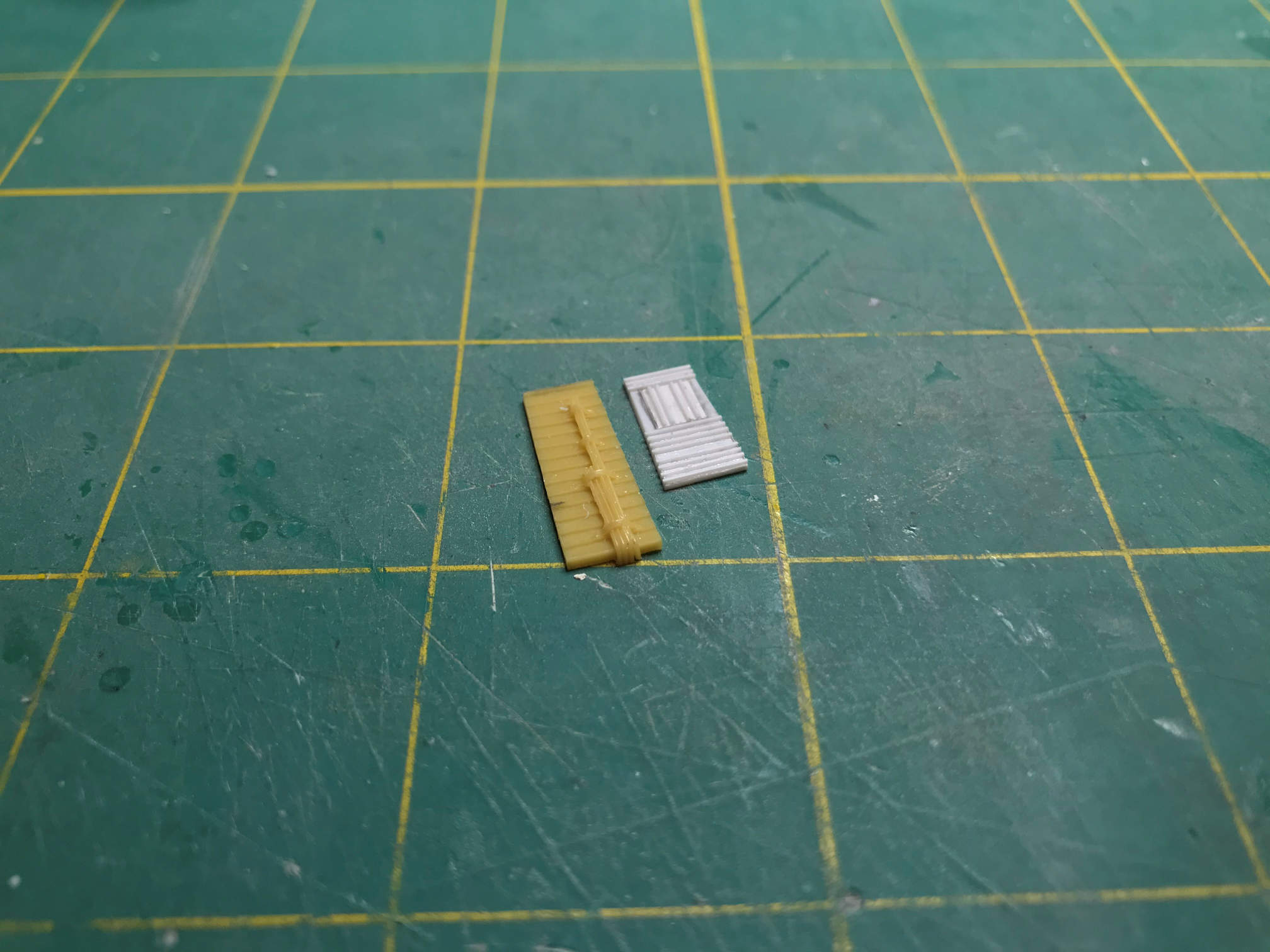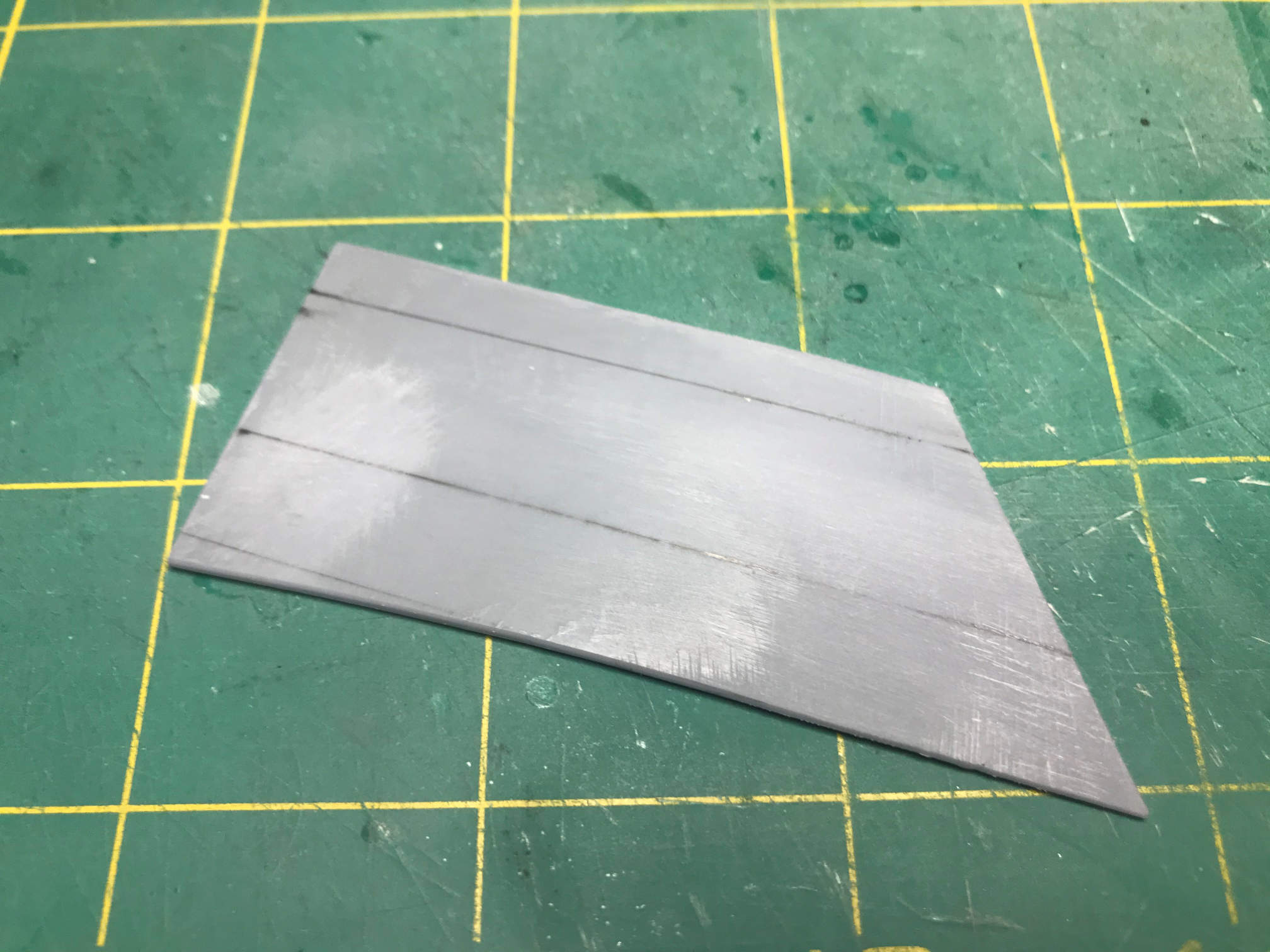 Back to the ventral fin. The movable portion of the ventral fin is ejected before landing otherwise the fin would hit the ground before the skids did. The ejected portion had a parachute in it so it could be recovered and reused. This meant that I needed to model a parachute door on the back side of the fin. The supplied resin part didn’t have any provision for a parachute door and it also had piping molded in that never existed on ventral fin of the actual plane. Removing the piping would pretty much destroy the part. So it was just easier to scratch a new one. I took a section of .01 sheet stock cut to the proper shape and then marked where I wanted the door to be. Next I glued on sections of .01 x .01 strip stock to represent the corrugations. Then I cut a rectangle of .005 sheet stock to represent the door. Onto that I glued some more .01 x .01 strip stock. I then glued that to the gap in the strips I had left. Here is a photo of the original part and my scratch build replacement.