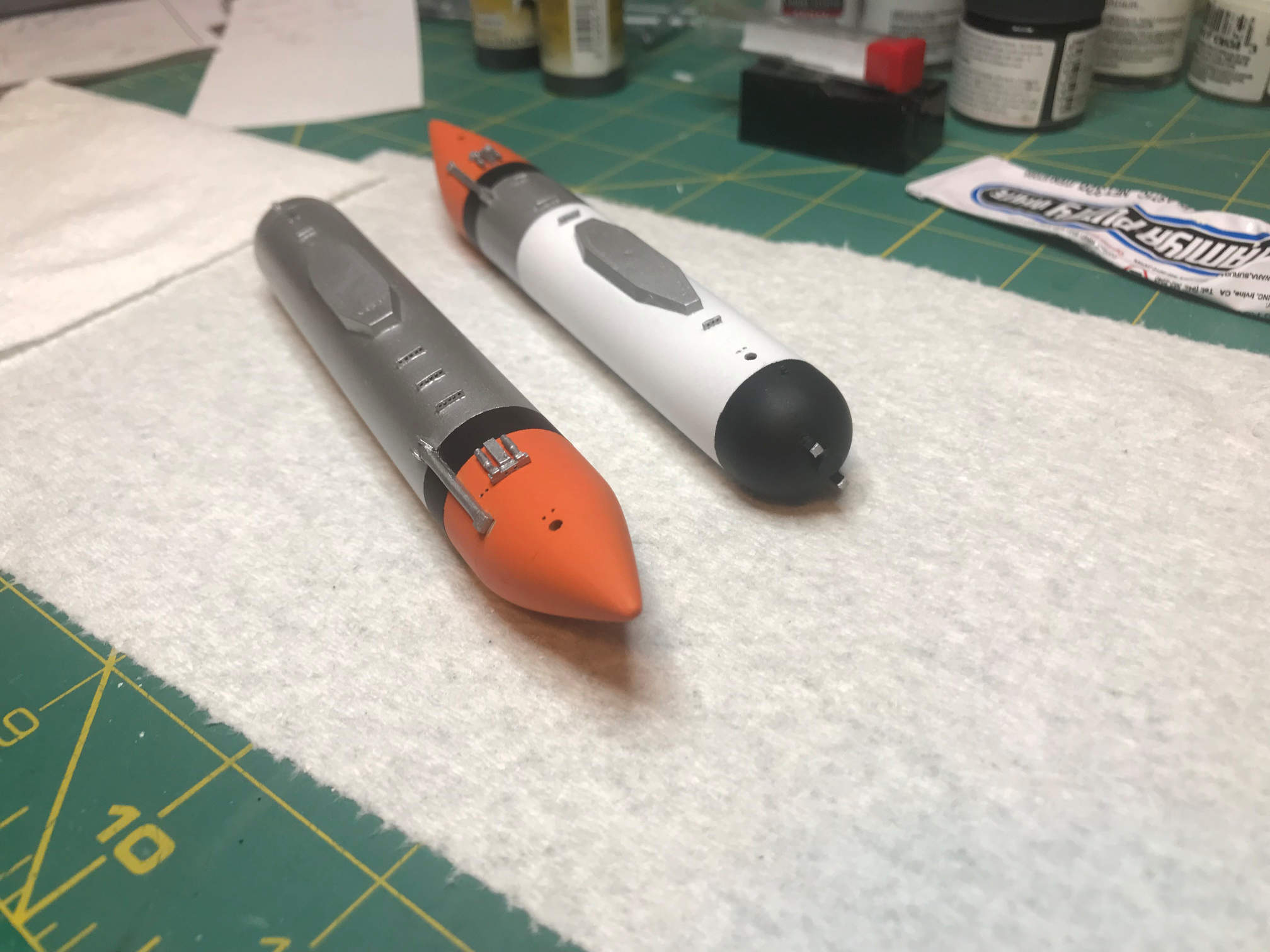 At the end of the last update, I had the external tanks painted and ready for the final details to be added. I did that by using CA to attach a device that I had previously scratch built. I’m not sure the exact function of this device. I can’t find any documentation for it as of yet. However, it is built and looks similar to the one on the actual tanks. I painted it silver and then attached it to each tank. I then sprayed on a clear coat to prepare them for the decals.