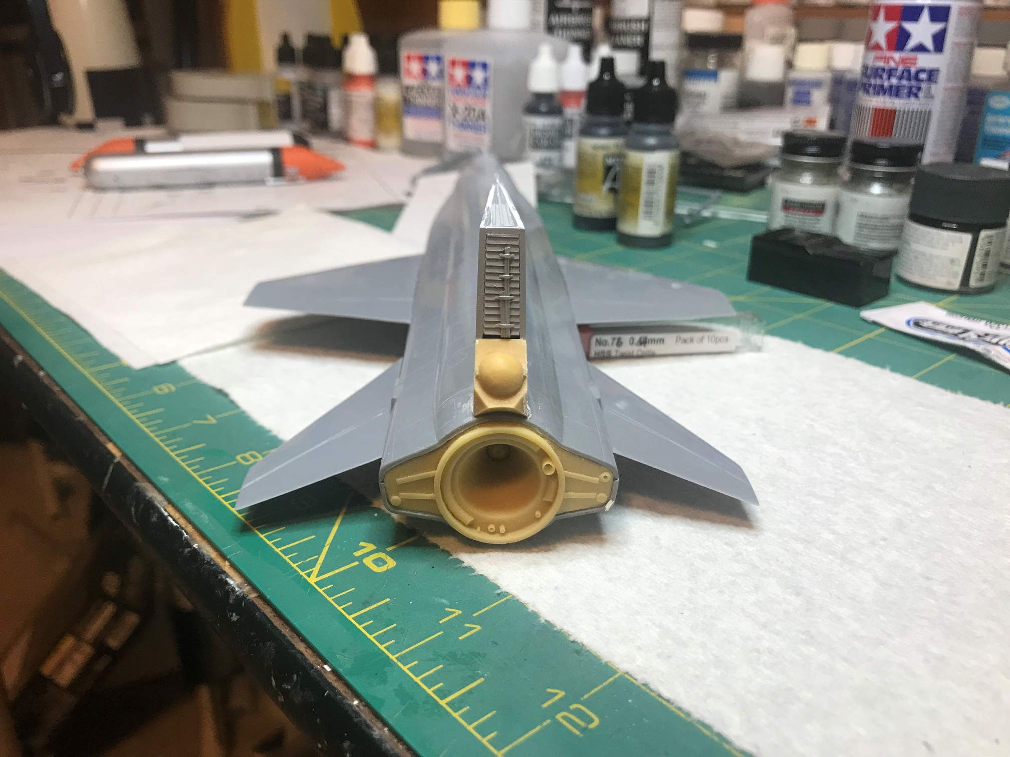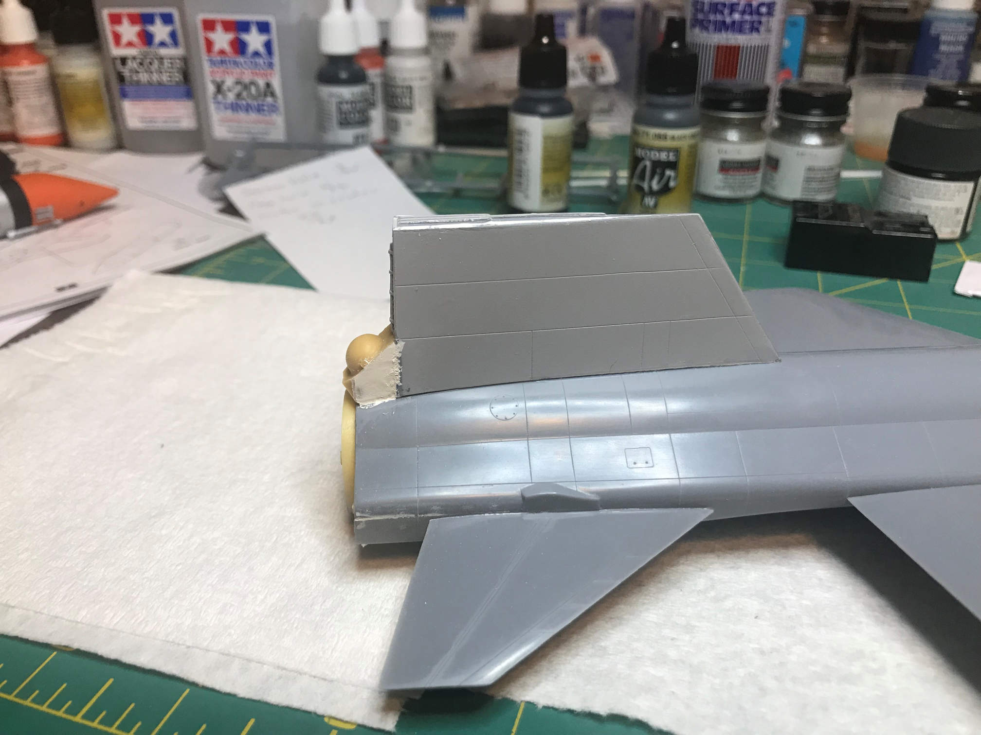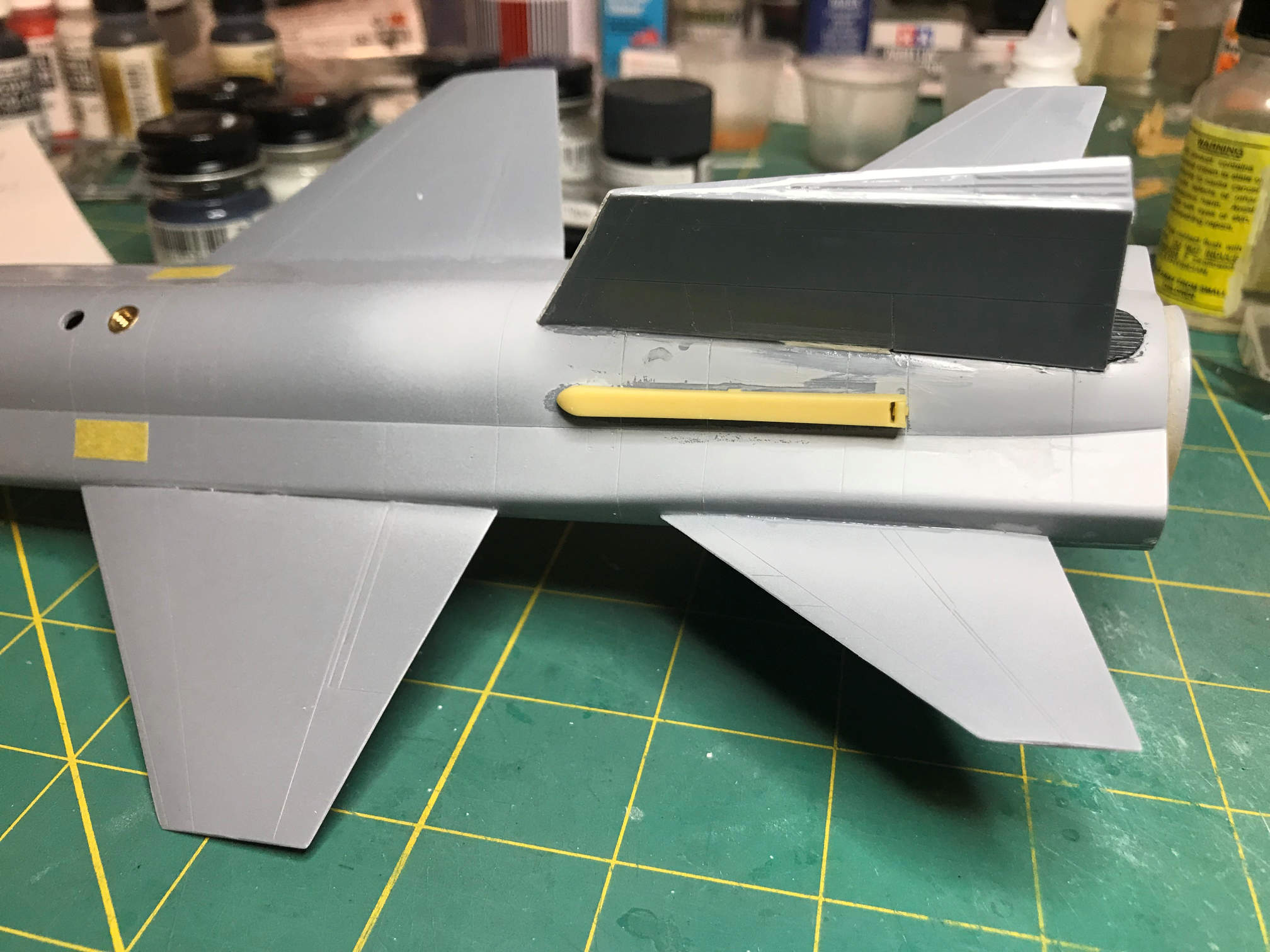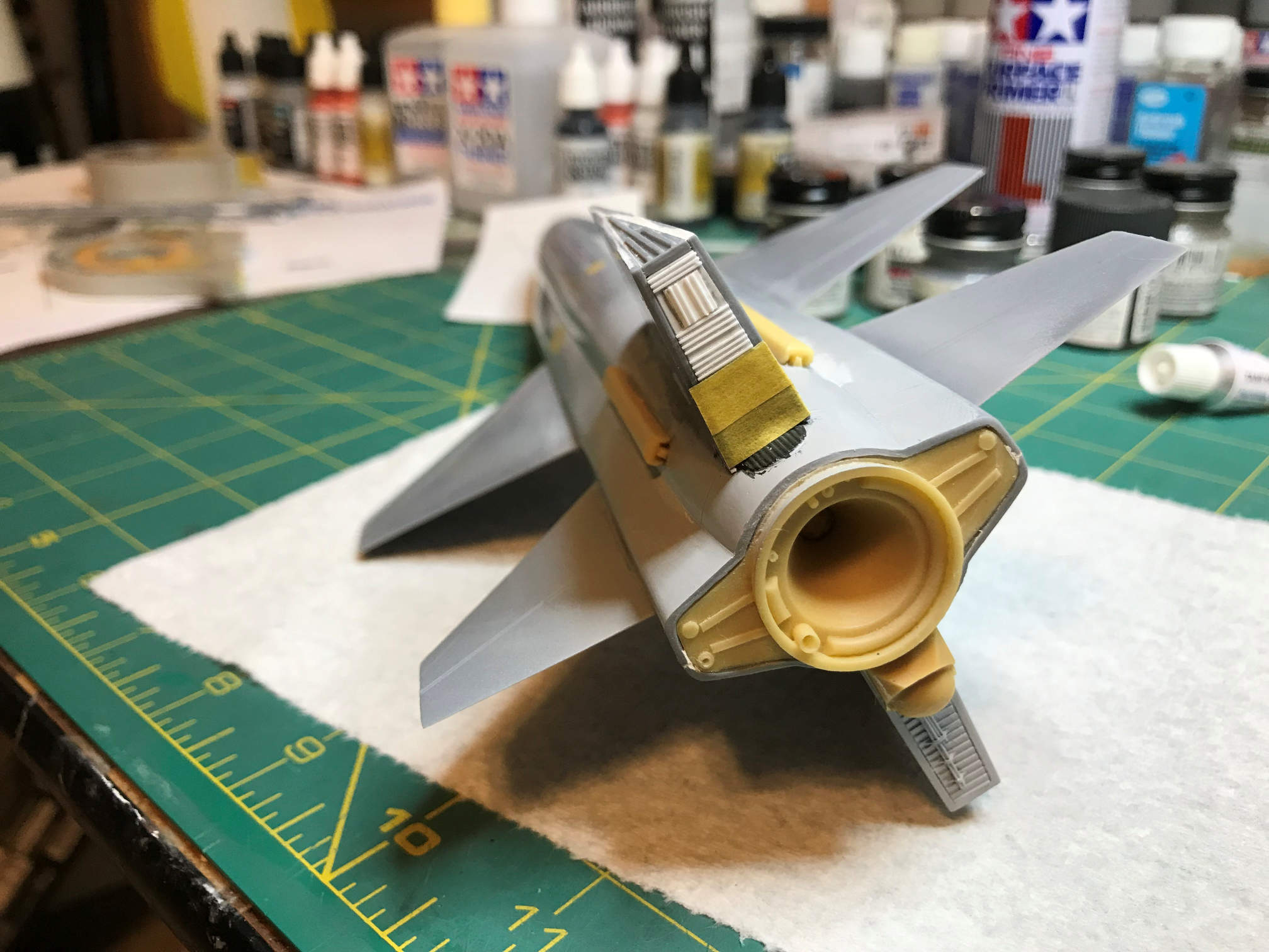 I then added some masking tape to the back of the ventral fin/rudder at the air brake opening. This will keep primer and paint from getting on the detail parts inside that are already painted.