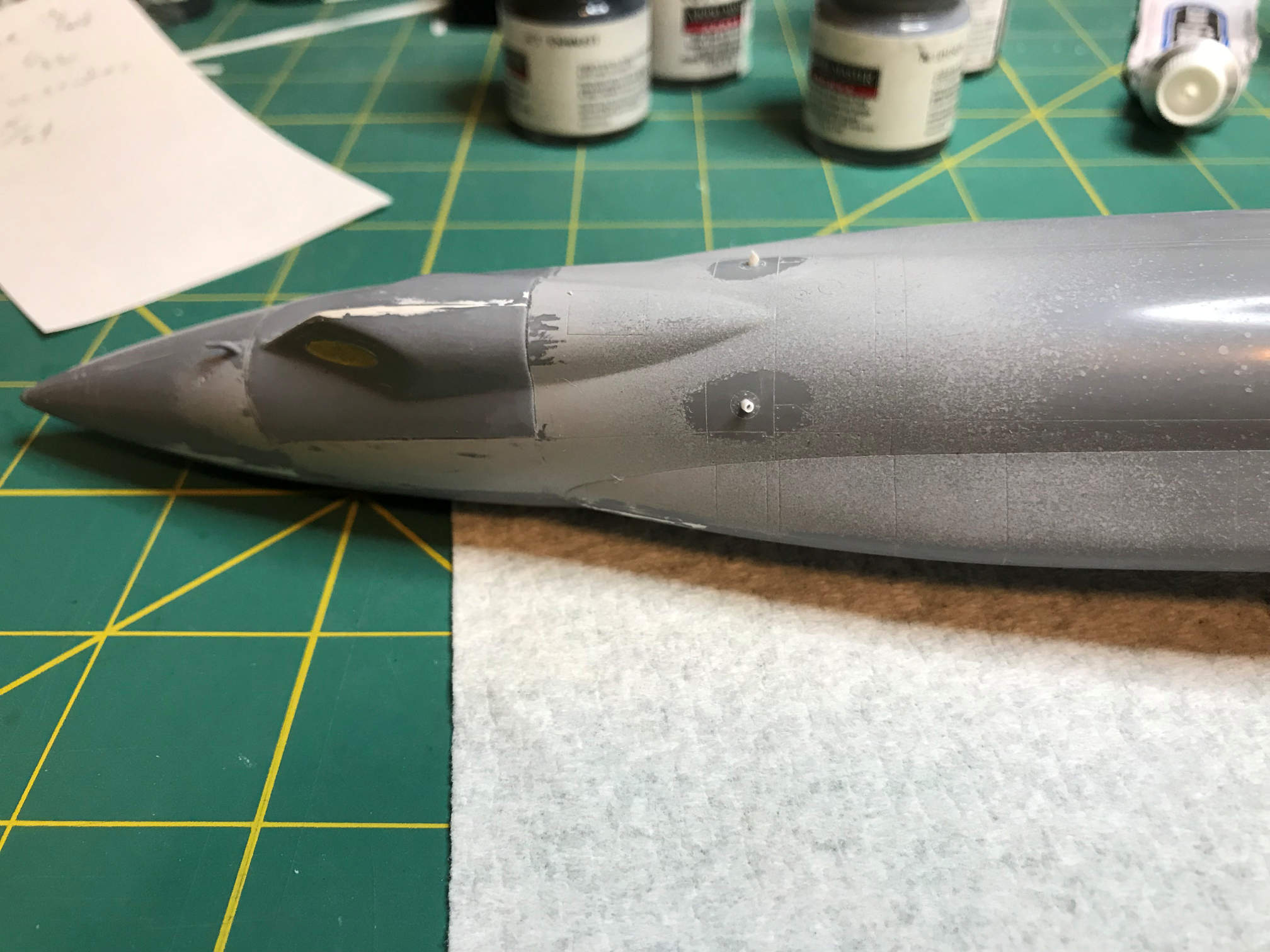 After cleaning up some final spots that needed some more filler I sprayed primer over the whole model. This let me better see if I had some additional areas that needed filling. Of course there were. I had to do additional work on the wing/fuselage joints, the fuselage halve seam, the ball nose and a couple of spots at the back near the engine. When those were cleaned up I sprayed primer again.