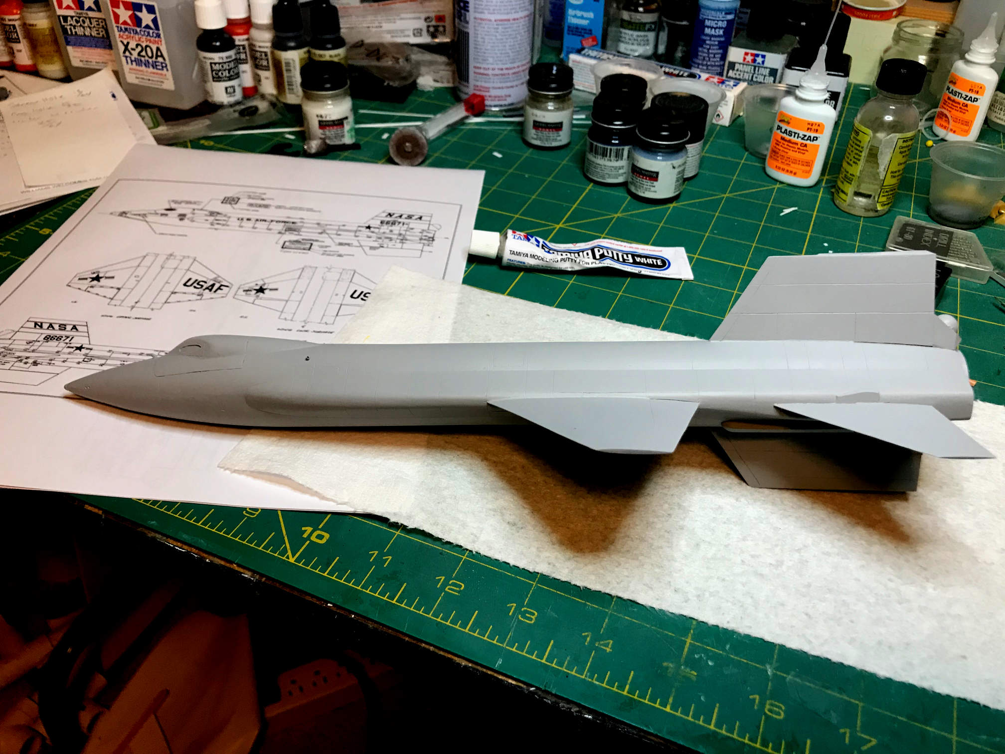 The only parts left to add are a couple of antennas on the lower side of the fuselage and the two vent booms that project from the back of the rocket motor. I’m leaving them off until painting is finished since with all the handling that will need to be done I will probably break them off if I put them on now.