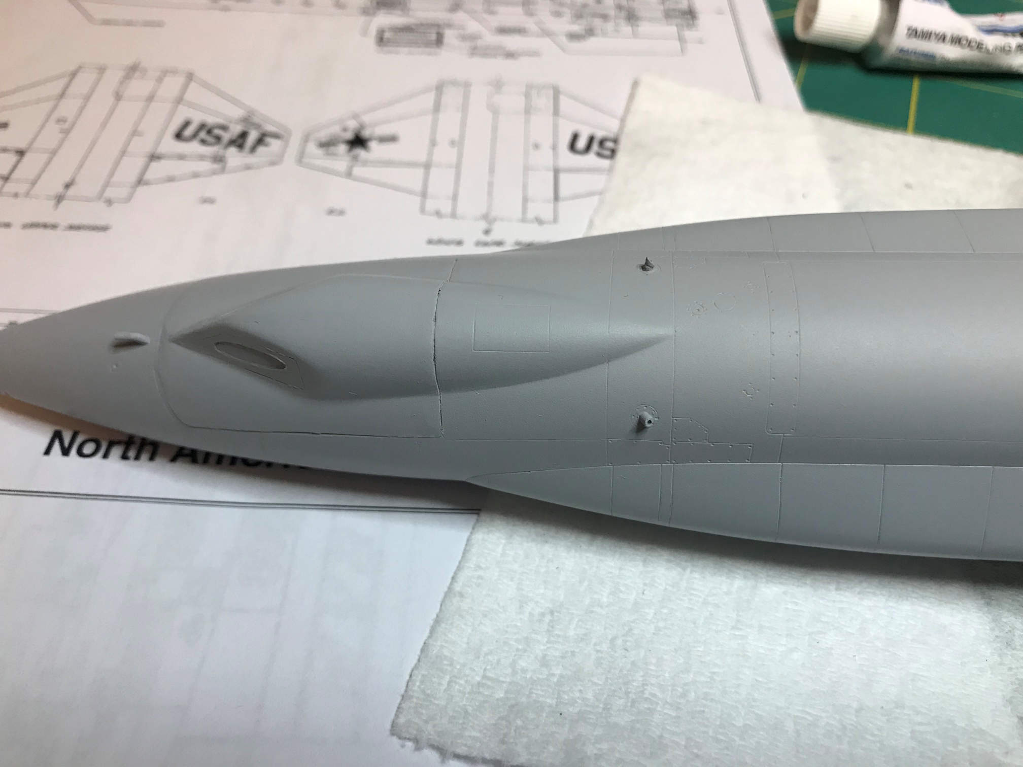I lastly went back and re-scribed some panel lines near the front of the tunnels that run along the sides of the fuselage.