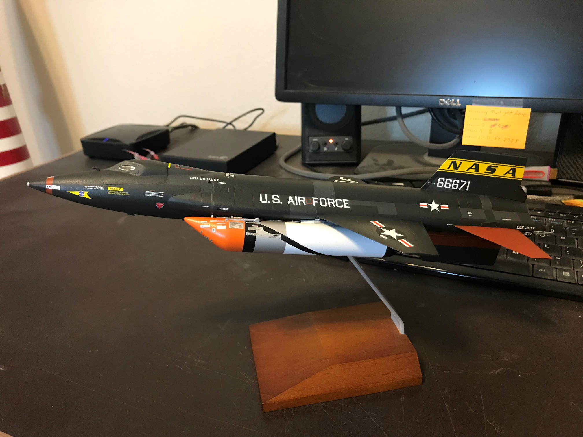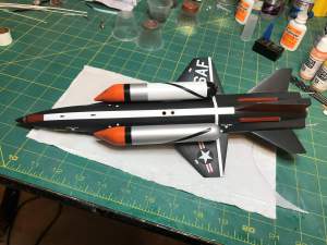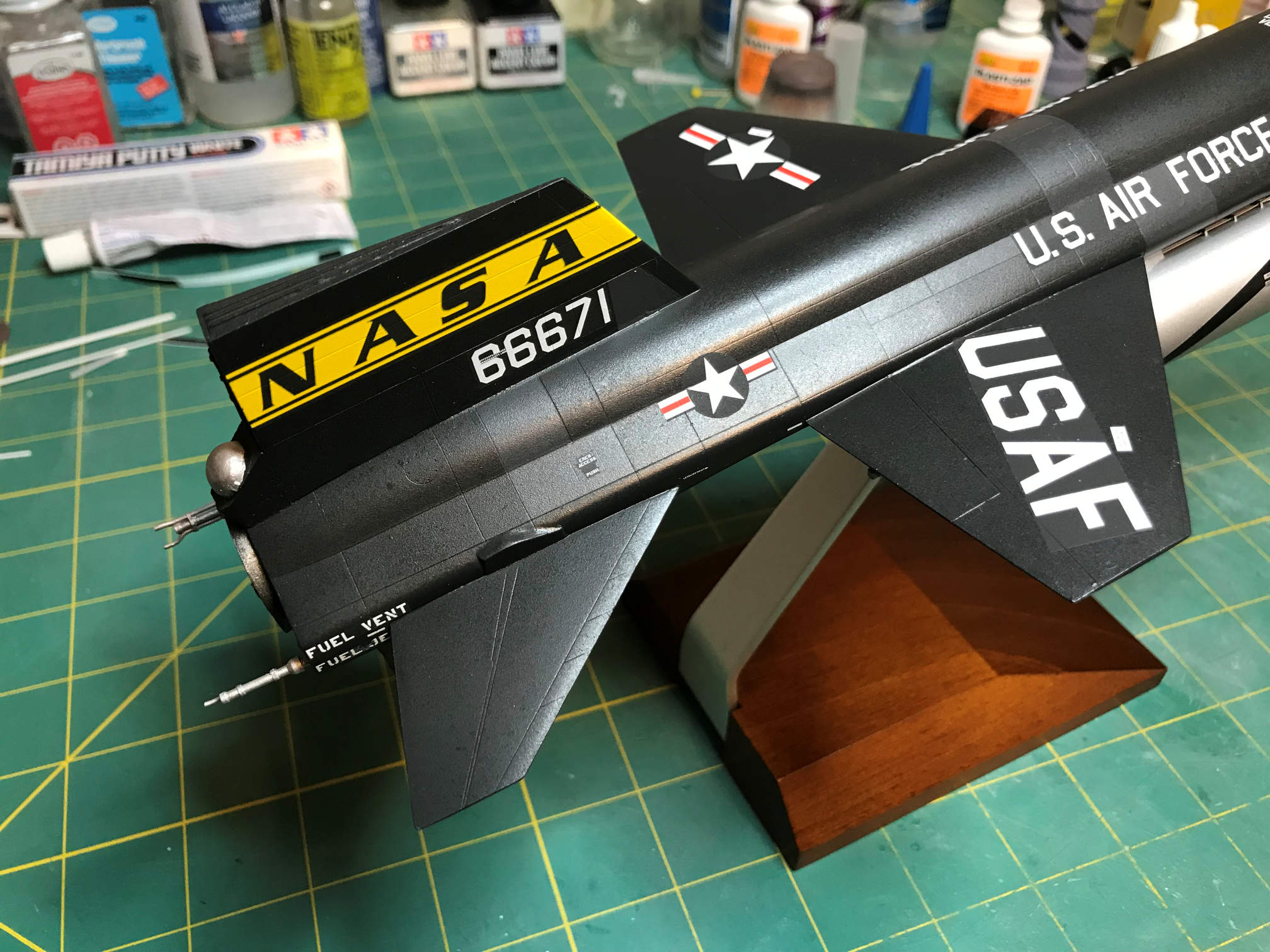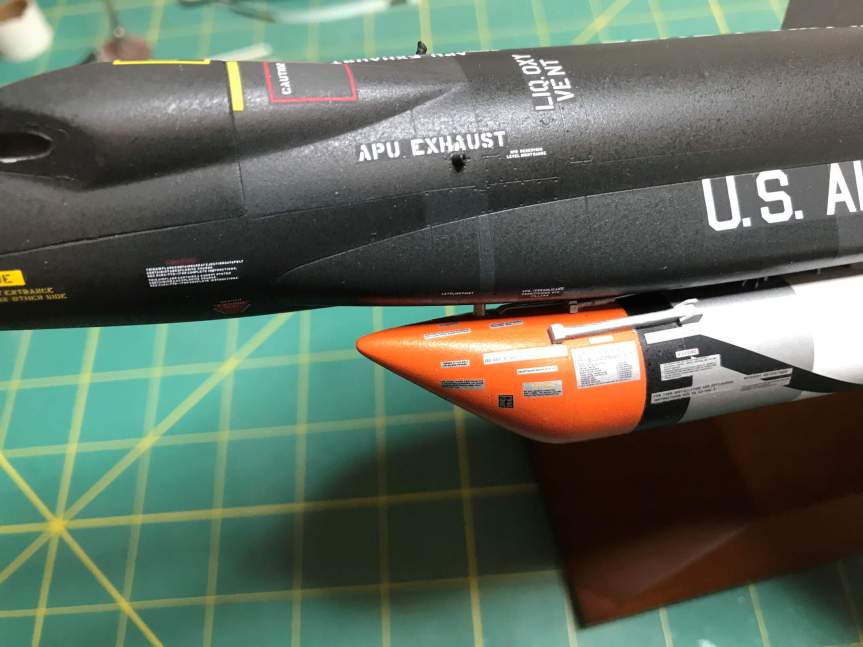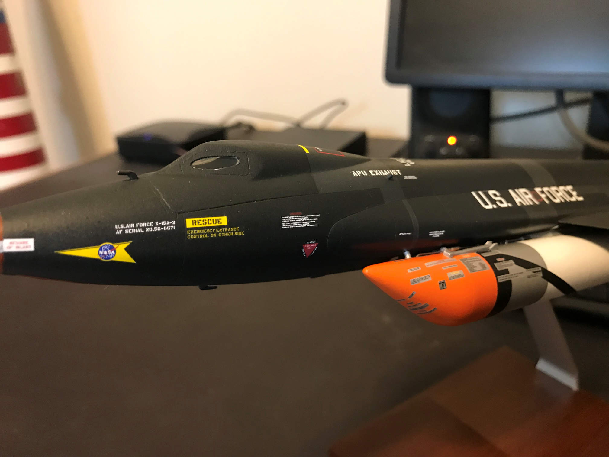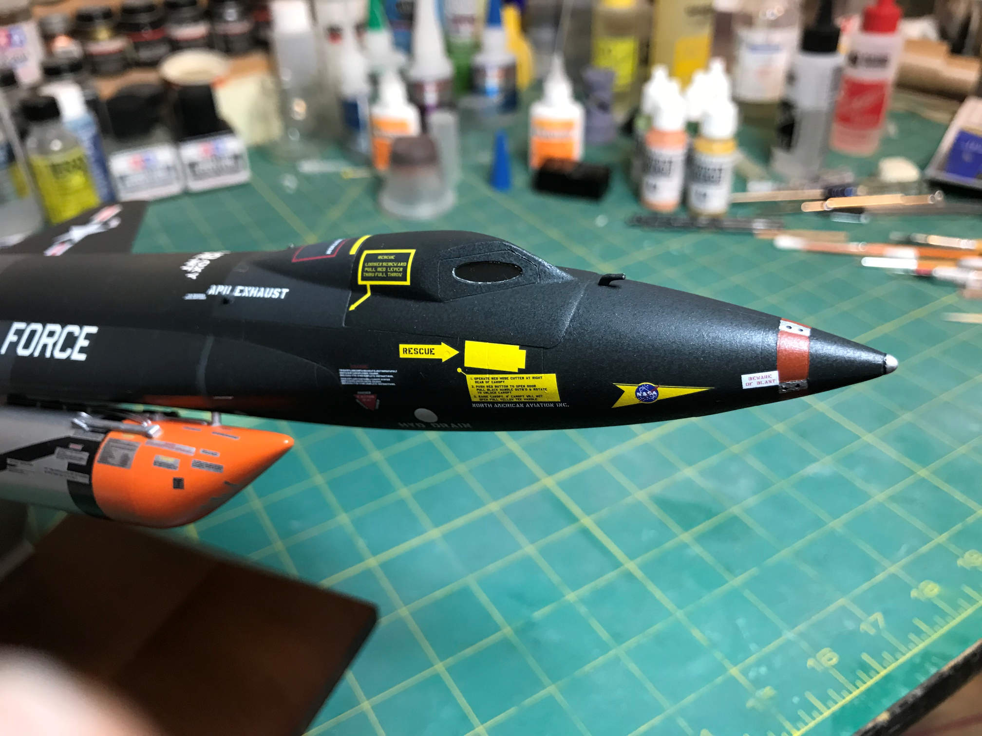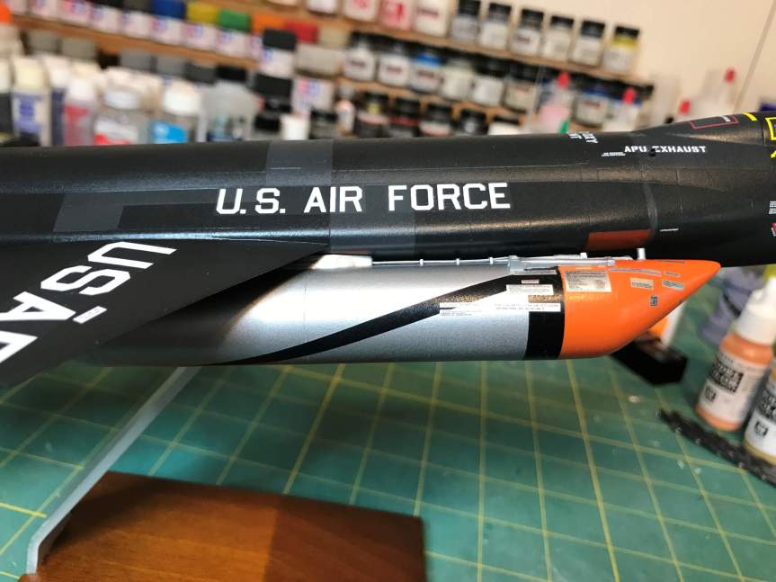 I used only a few of the kit supplied decals. Namely, the yellow NASA tail stripe, the large and small “Star and Bars”, “U.S. AIR FORCE”, and the large “USAF” decals. All the other decals came from the aftermarket Hypersonic decal sheet. This is an excellent decal sheet. I believe that there are markings for any variation of the three X-15 aircraft.