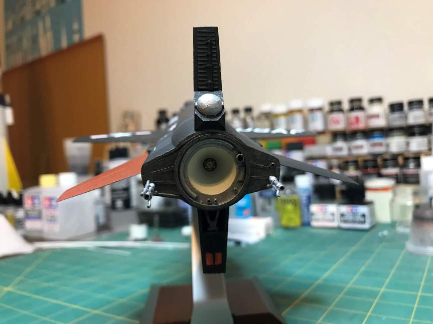 You can also see that at this point I’ve added the two underside antennas. I left the masking over the screw hole so that the upcoming clear coats will not gum up the threads.