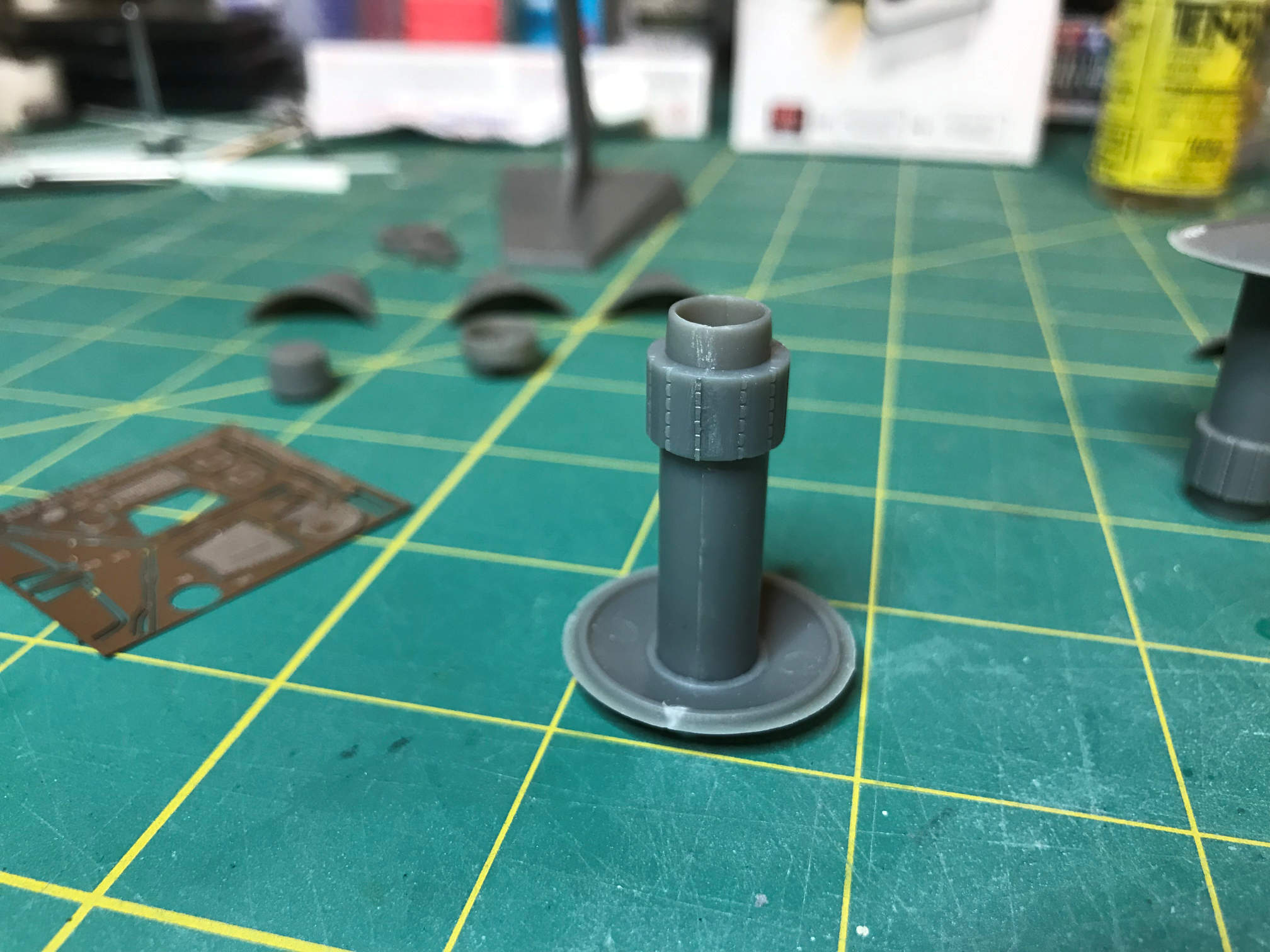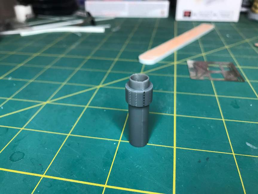 I then glued together the part that contains the cylindrical portion of the capsule. This part is also used to align the capsule’s conical sections. There are two small PE parts that cover the seam lines.