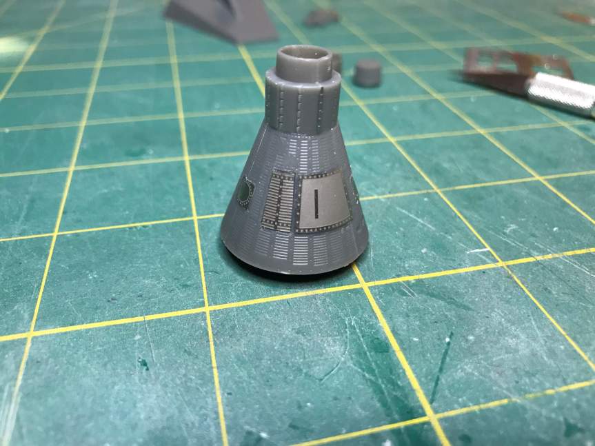 Next I’ll prime and paint the white area at the top of the capsule (and antenna cover) and then mask it and prime and paint the rest of the capsule. But that will have to wait for the next update.