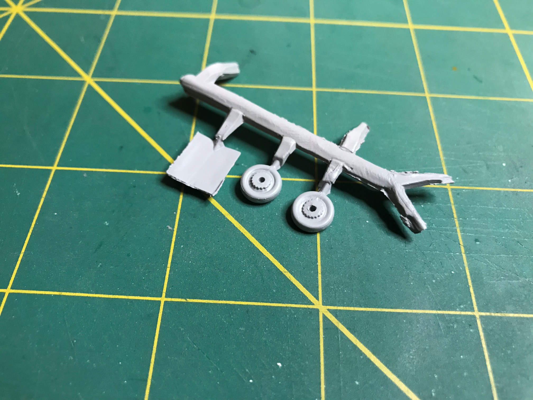 I painted the wheels before gluing them to the struts. The struts had already been painted silver before adding the wheels. In the above picture you can also see the spin recovery ‘chute compartment still attached to the runner. As far as I could tell the serial number HB1002 aircraft, which is the one I’m modeling, did not have it.