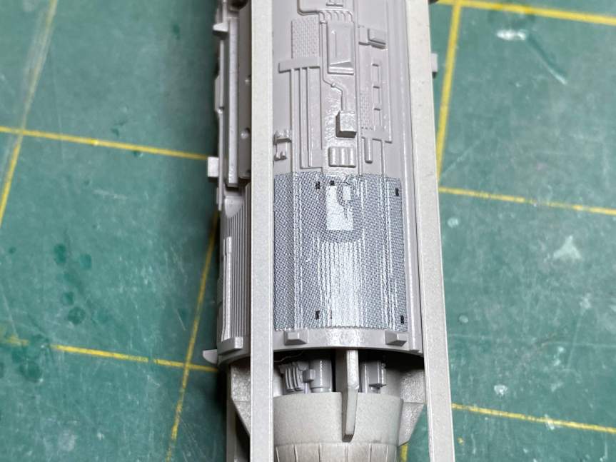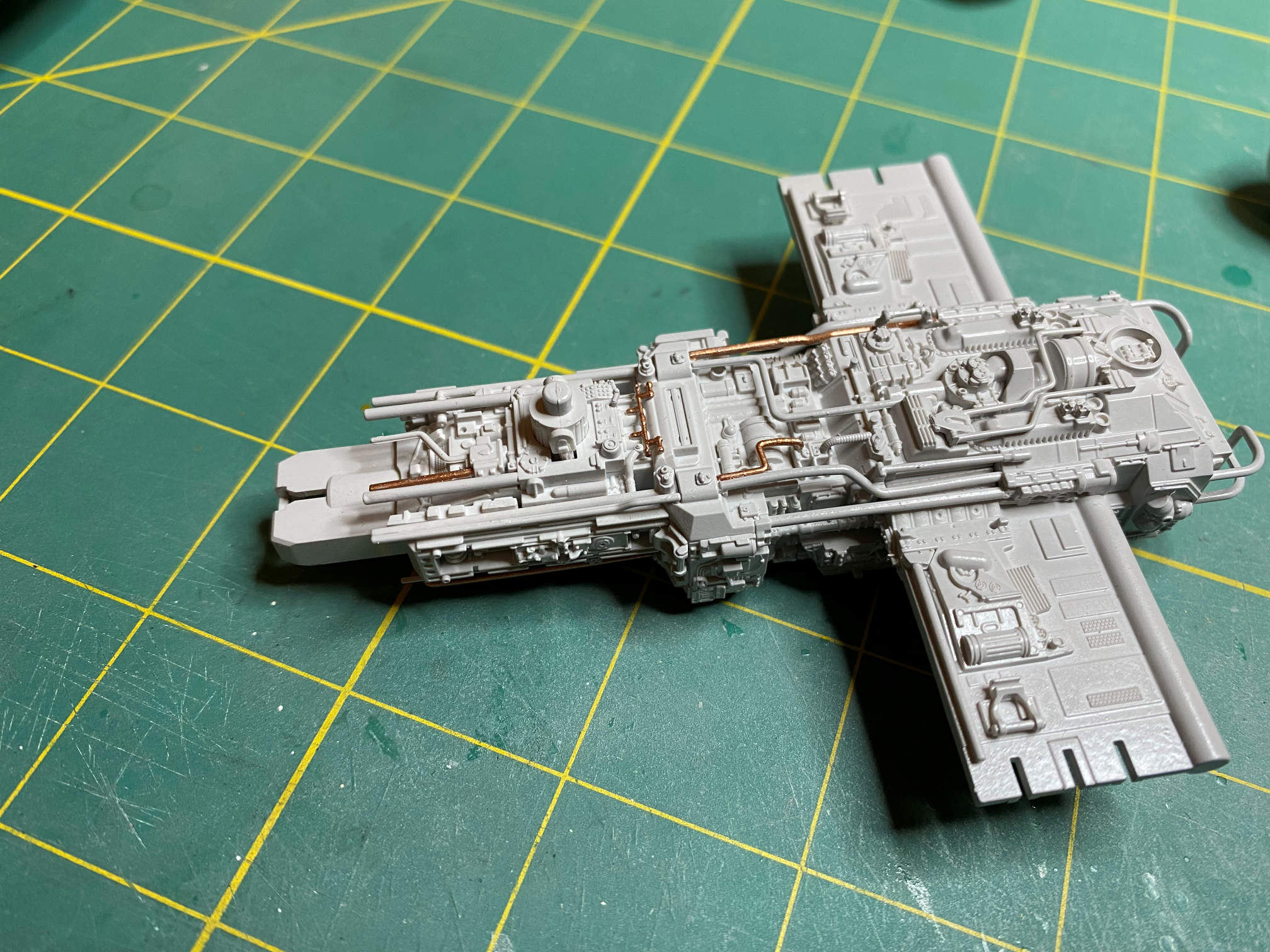 I went back to the main fuselage and painted a few pipes with copper. I think it helps to bring attention to the amount of piping that is on this section of the kit.