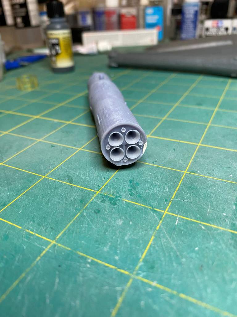 As part of making the .stl file I was able to remove the grid fins. I didn’t want to print those on the shroud as I wasn’t sure how well they would print. Here is a photo of the top of the 3D part. You can see where I glued the parts back together. A little filler will take care of the gap. I love the details on the launch escape rocket.