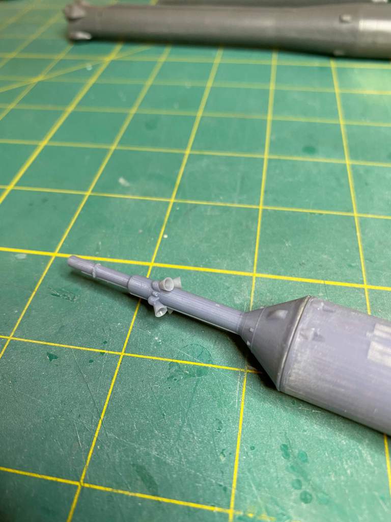 In the above photo I have already glued the top of the shroud to the rest of the 3D printed upper stage. You can see the difference in the 3D printed part and the resin pretty well. These are oriented to the same direction, with the periscope cover pointing up and left. If I could have modified the Fusion 360 part I would have thickened the nozzles just a bit so they wouldn’t be quite so thin. It’s not that the file was locked or anything, it is just that the 3D model is quite complex and I was having a very hard time finding where to make the change. Anyway, once the part was cured they were nice and stiff and solid, but being so thin I am careful that I don’t wack them against anything.