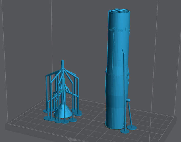 First, I re-scaled it to 1/144. The 3D files were 1/50 scale. I then saved it as an .stl file. This I loaded into Meshmixer and cut off the top part of the spacecraft shroud with the launch escape rocket and saved them as separate files. I then loaded them into my slicer and added some necessary supports and started the printer. Here is a screenshot of the 3D file in Fusion 360.