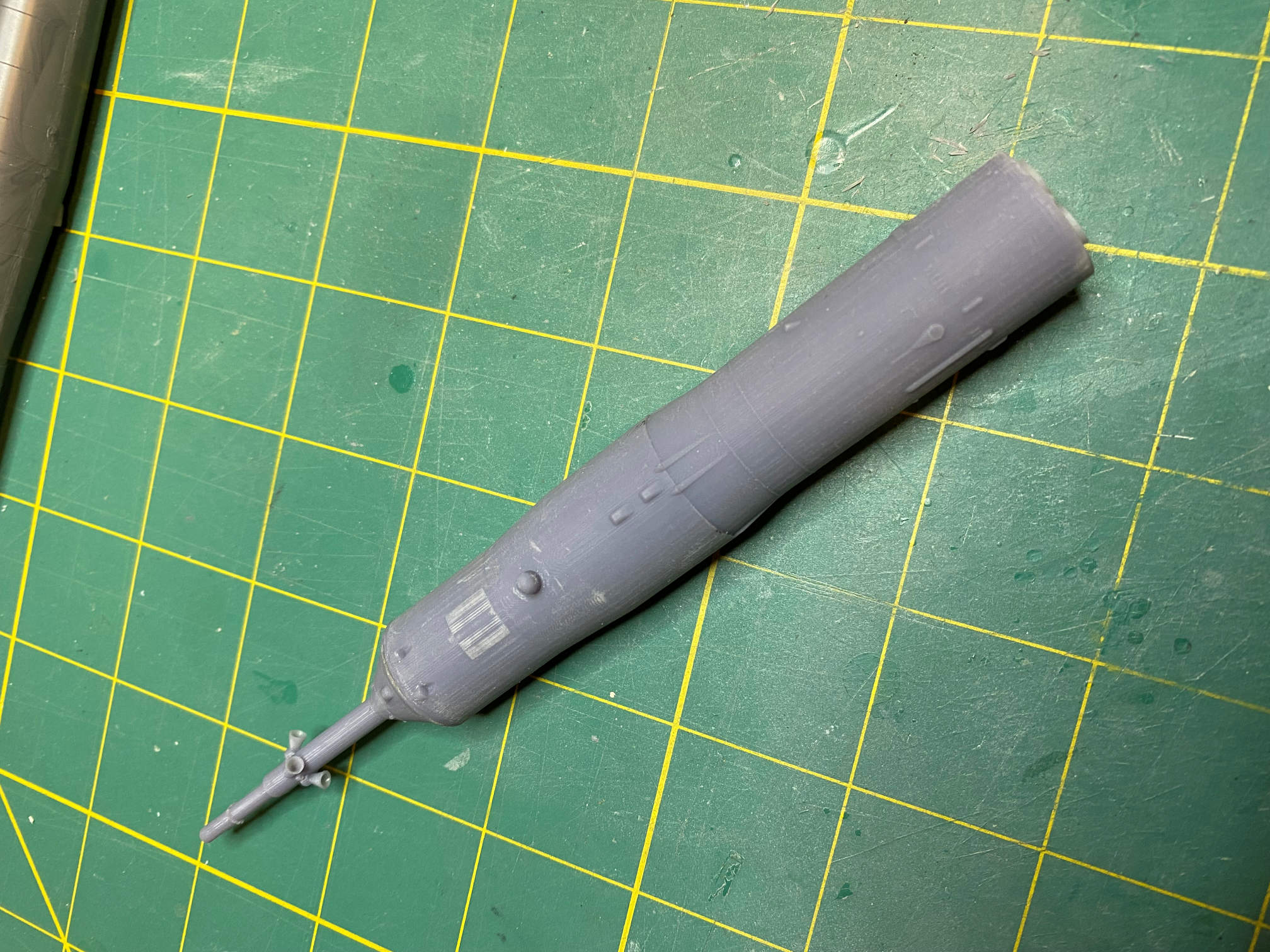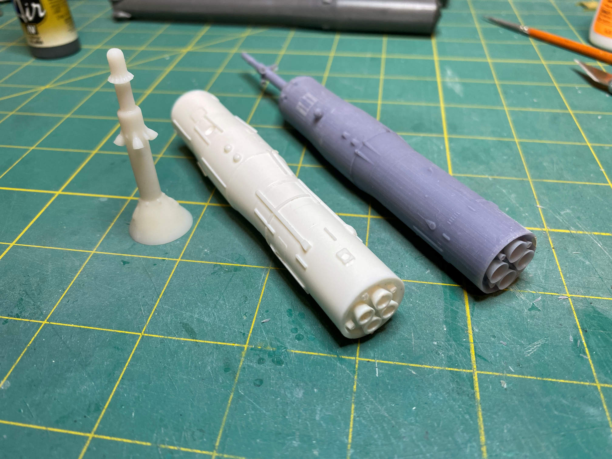 In the above photo I have already glued the top of the shroud to the rest of the 3D printed upper stage. You can see the difference in the 3D printed part and the resin pretty well. These are oriented to the same direction, with the periscope cover pointing up and left. If I could have modified the Fusion 360 part I would have thickened the nozzles just a bit so they wouldn’t be quite so thin. It’s not that the file was locked or anything, it is just that the 3D model is quite complex and I was having a very hard time finding where to make the change. Anyway, once the part was cured they were nice and stiff and solid, but being so thin I am careful that I don’t wack them against anything.
