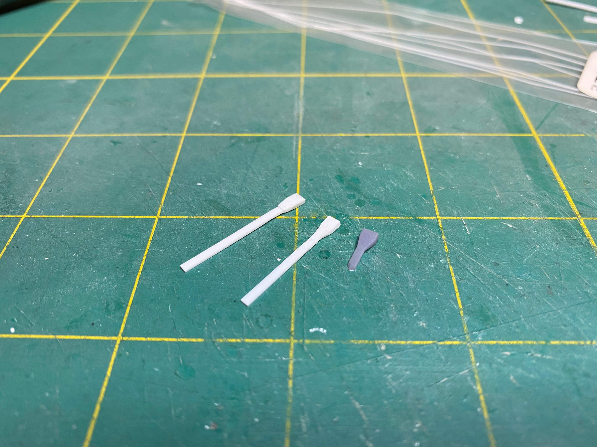 I’ve also fabricated the two umbilical connectors that run from the first stage to the second stage. The small gray piece next to them is from the 3D part that I was using for a pattern. The wide part is a stack of four sections of .010x.100 strip stock and then carved to the proper profile. The tails are .020x.060 strip. The long tails will be trimmed and the end lightly rounded before I add them to the model.