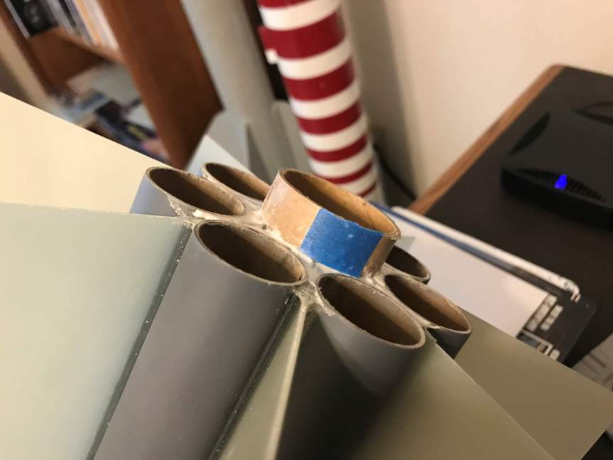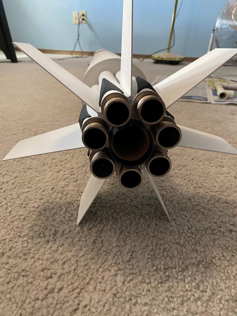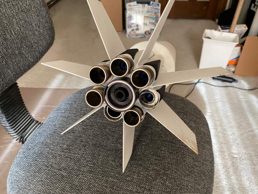 After adding the parachute and shock cord the rocket weighs in at about 7.5 pounds. I’ll use a Chute-Release for parachute deployment. The false nozzles are friction fitted to the tubes. This way when the rocket lands under chute it hopefully won’t damage the end so much as just push the nozzles into the tubes. I can then pull them back out. It will also make it easier to replace any damaged nozzles since they are not glued in place. That’s the theory anyway. We’ll see how it works out this weekend when it will make its first flight.