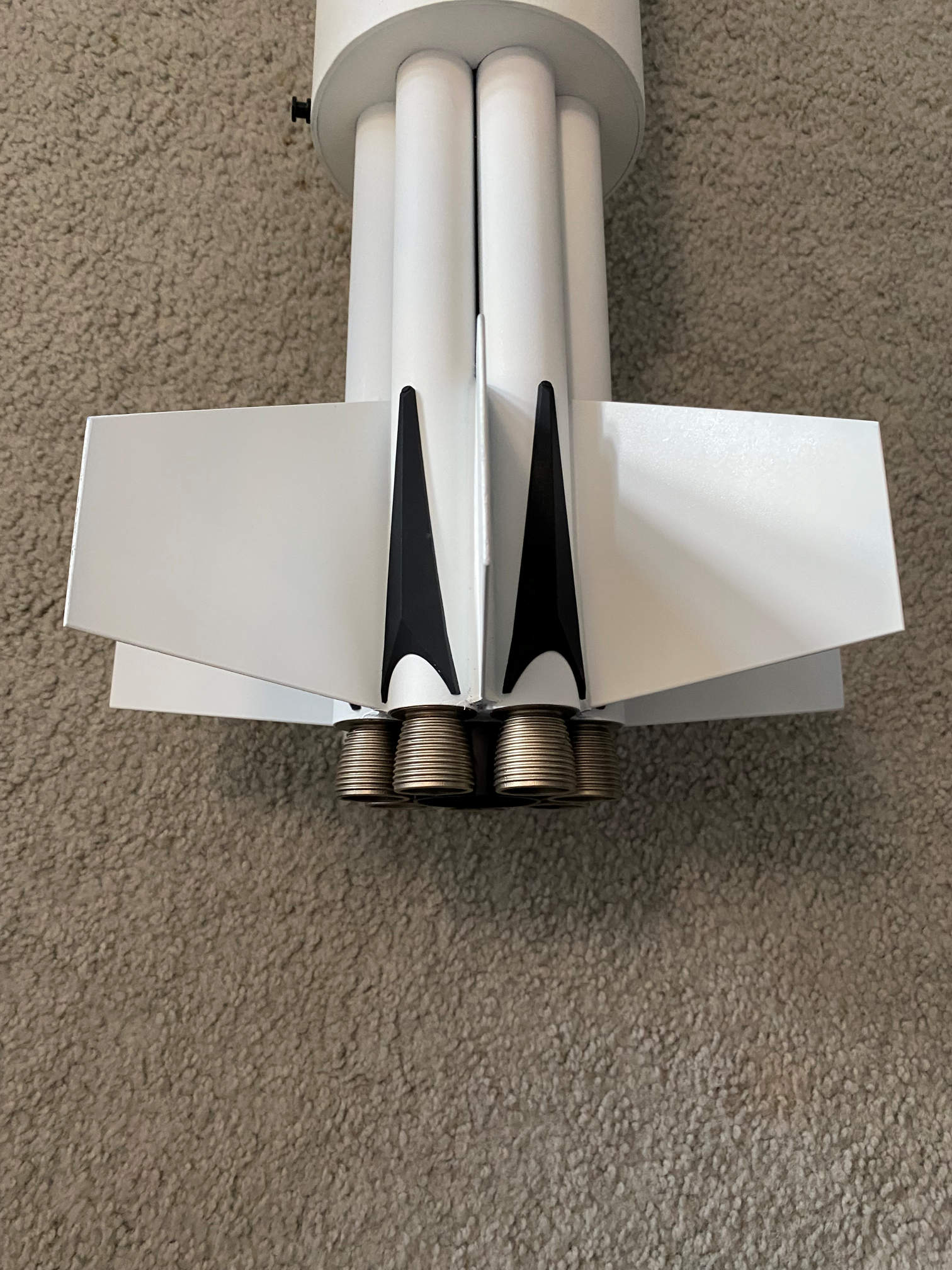 After adding the parachute and shock cord the rocket weighs in at about 7.5 pounds. I’ll use a Chute-Release for parachute deployment. The false nozzles are friction fitted to the tubes. This way when the rocket lands under chute it hopefully won’t damage the end so much as just push the nozzles into the tubes. I can then pull them back out. It will also make it easier to replace any damaged nozzles since they are not glued in place. That’s the theory anyway. We’ll see how it works out this weekend when it will make its first flight.