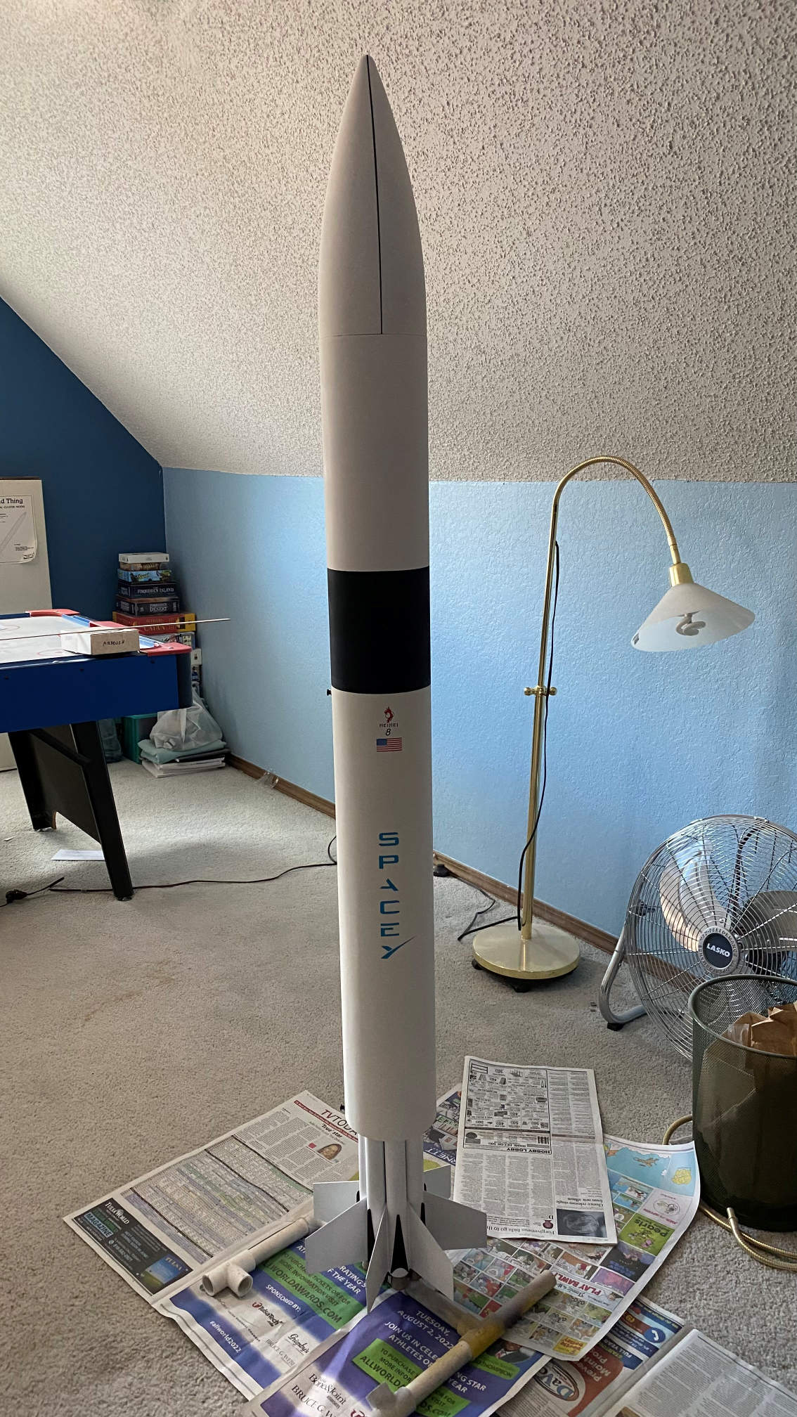 Part of what I did between June and July was to create some decals. I had decided that this rocket would be a kind of spoof on the SpaceX Falcon 9 rocket. The black line on the nose cone represents the separation line of the payload faring. The black band is the interstage. Haven’t gotten around to 3D printing some grid fins yet. I guess that can happen after its first flight.