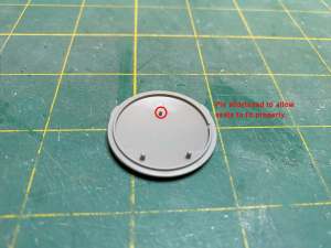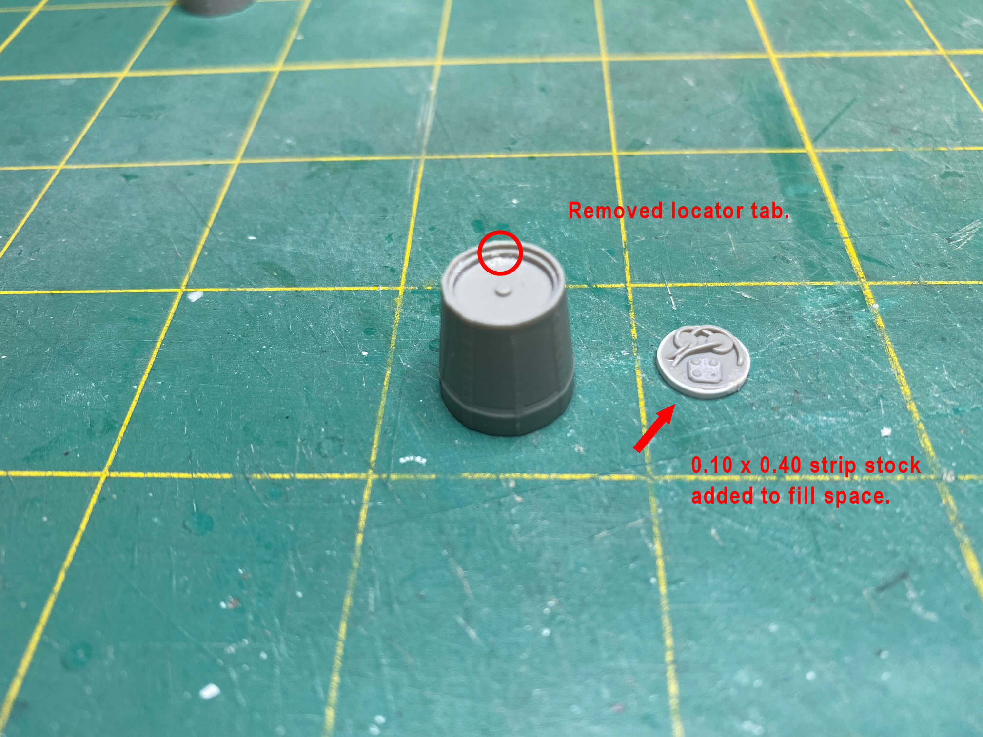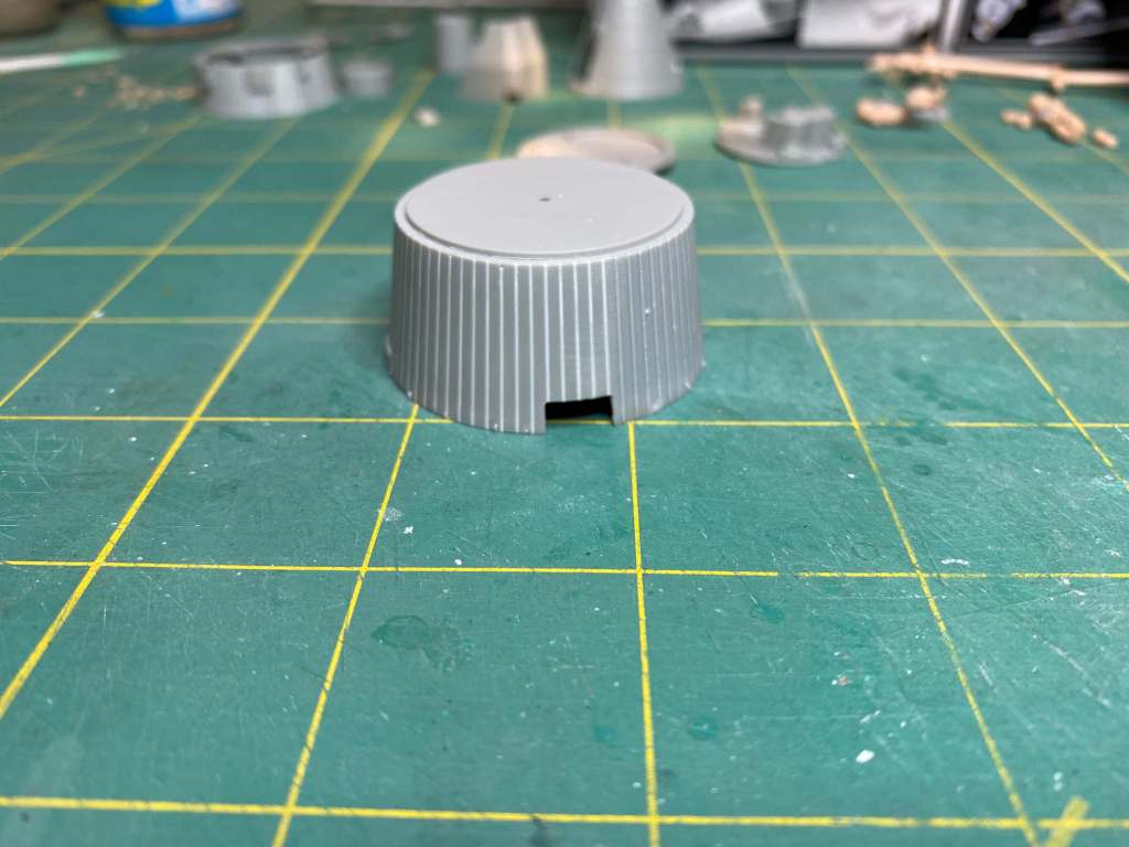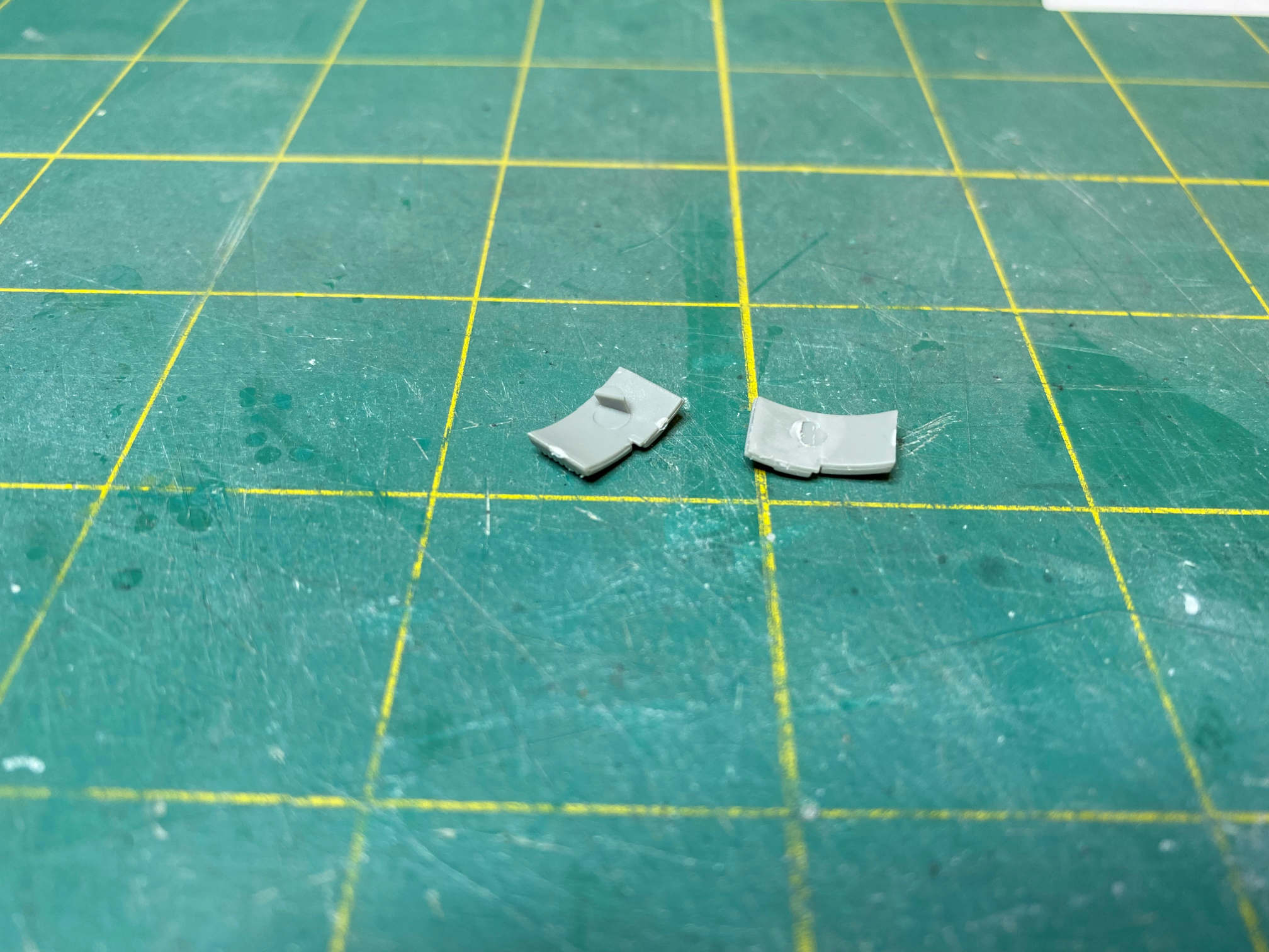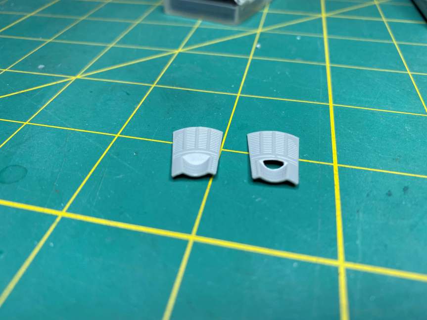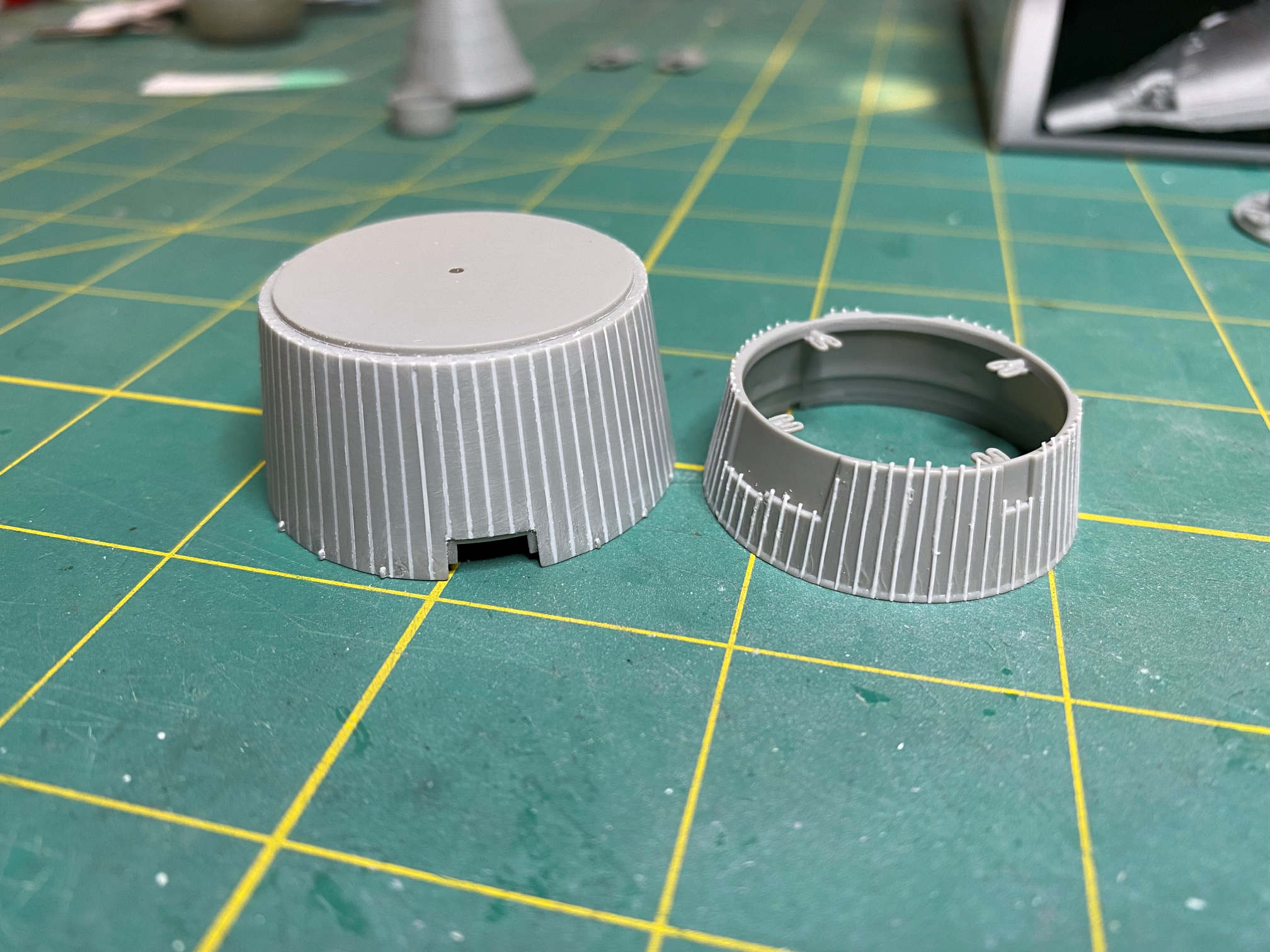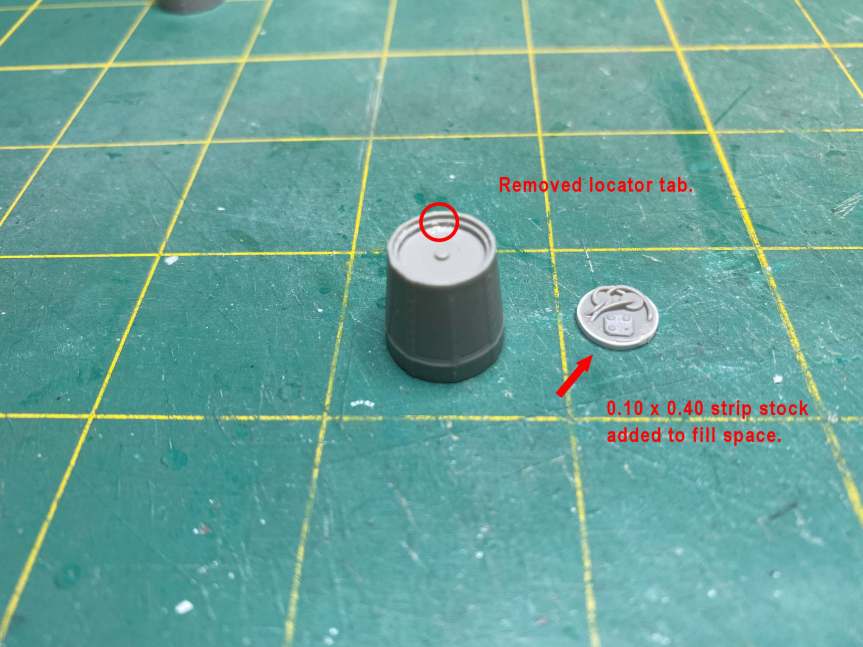 Moving over to the equipment adapter section, I test fitted the roll thrusters to their holes and found that they sat raised quite a bit above the rest of the adapter section. They should be flush, other than the actual thruster housing itself. The problem is that the mounting tabs are too thick for the part provided. I chose to remove the tabs. Here is a look at the problem and the fix.