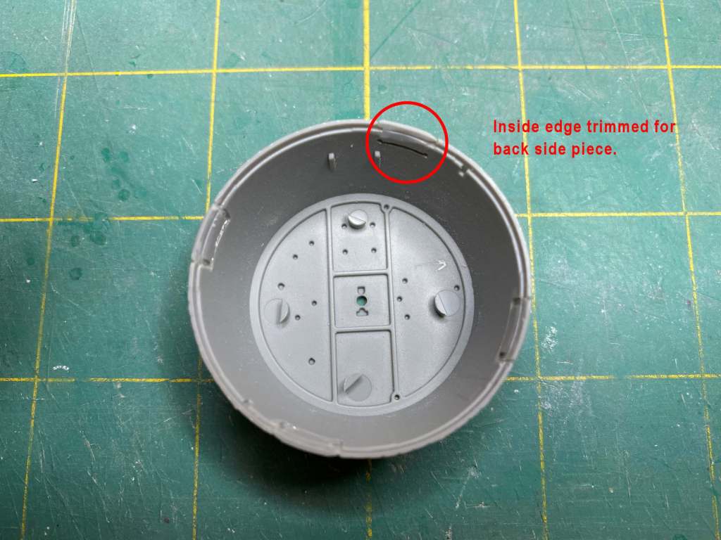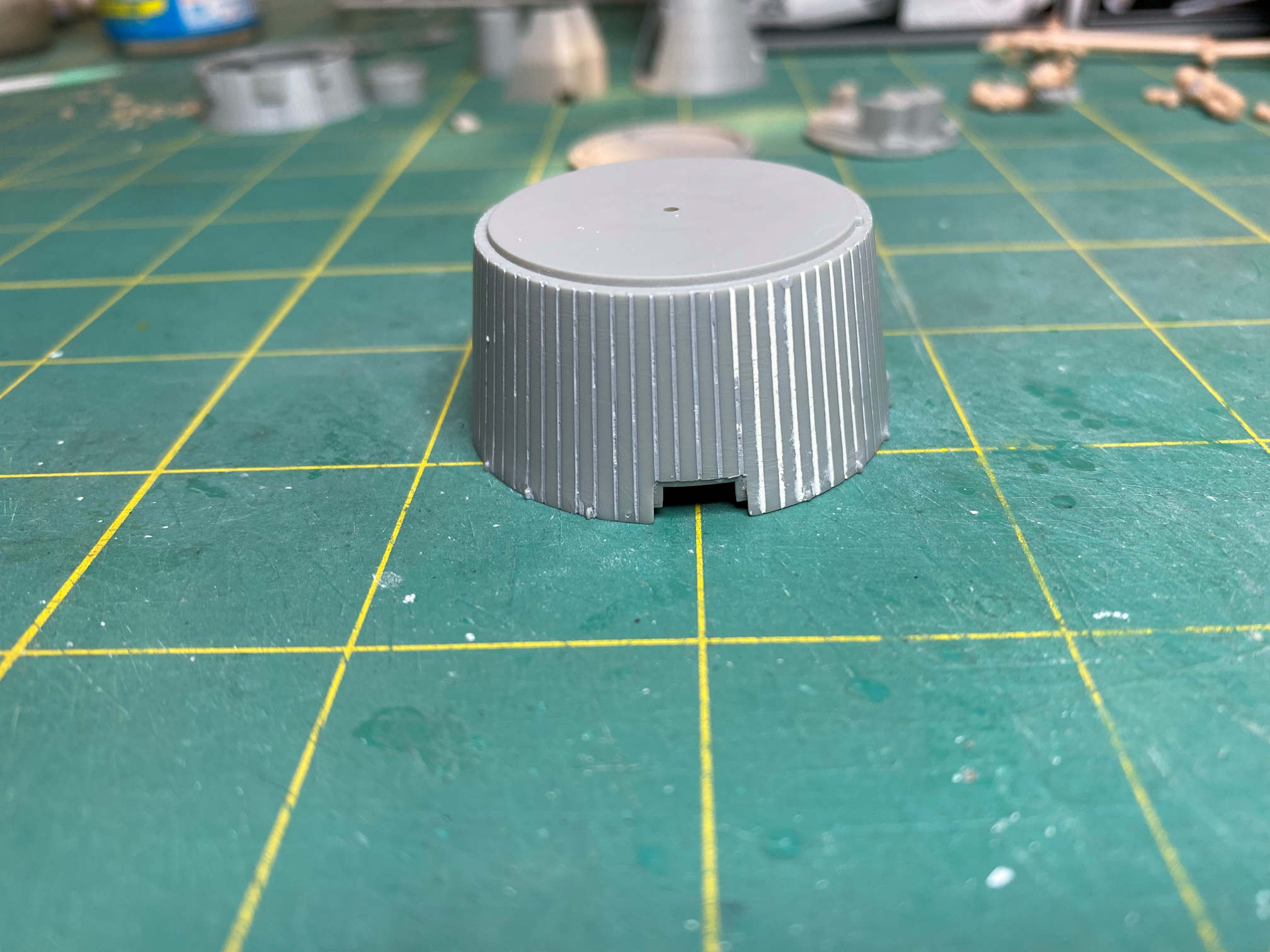 They fit pretty well now. It will take a bit of sanding and some filler to finish them off. I test fitted the adapter section cover to see how well it fit. It seemed pretty close, but I couldn’t get it to seat properly. I looked closely and found that, as a result of removing the mounting tabs, the thruster packages that I installed sat a bit deeper than designed. This required shaving a bit off the back of each thruster pack piece. Another test fit showed that it fit better but something was still getting in the way. This time I shaved a bit off the inside edge of the cover where it met the thruster housings. That did the trick. Here is a look at the solution.
