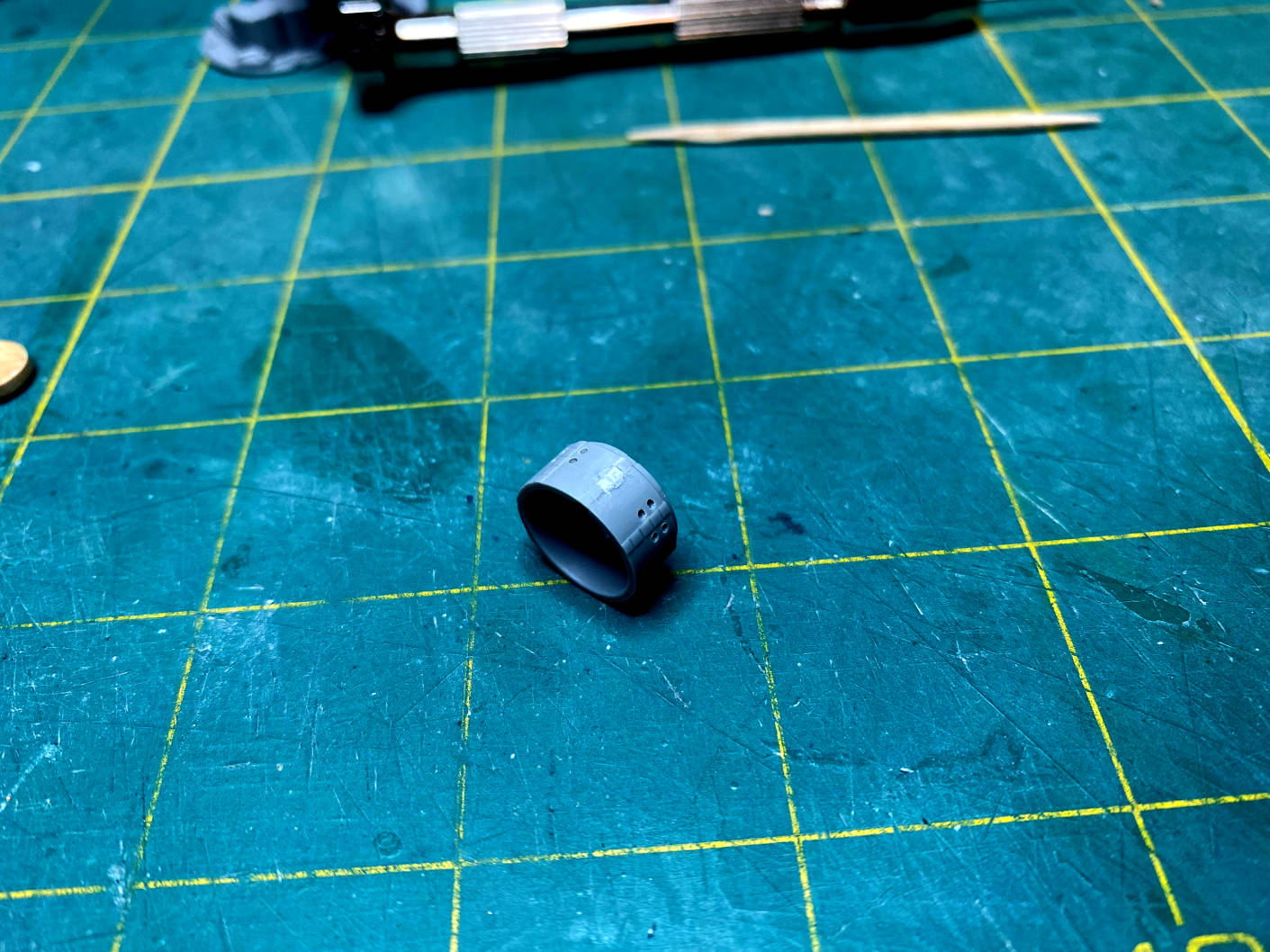 I was originally going to drill through the translate up thruster to put the rod that will attach the model to its base. After doing some dry fitting, it looked like that would be too close the the heat shield and might interfere with it. So I drilled a hole below the translate up thruster.