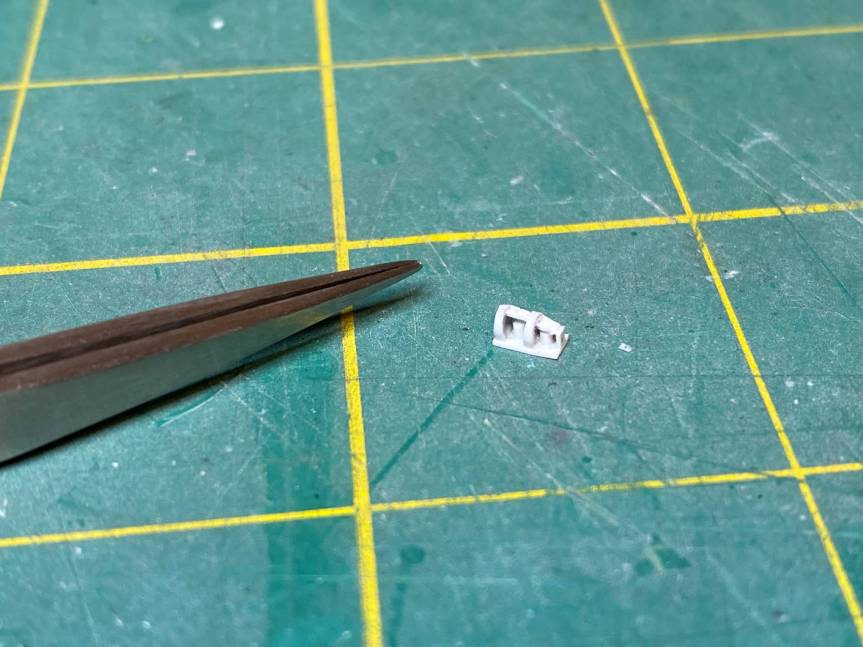 I then started on the part I was not looking forward to. The horizon sensors. At 1/72 scale they are very tiny and very hard for my fat fingers to work with. It is not exactly scale but I think it gets the idea across and at least there is something there that resembles the sensors instead of nothing. Here is a closeup of the part I scratched up.