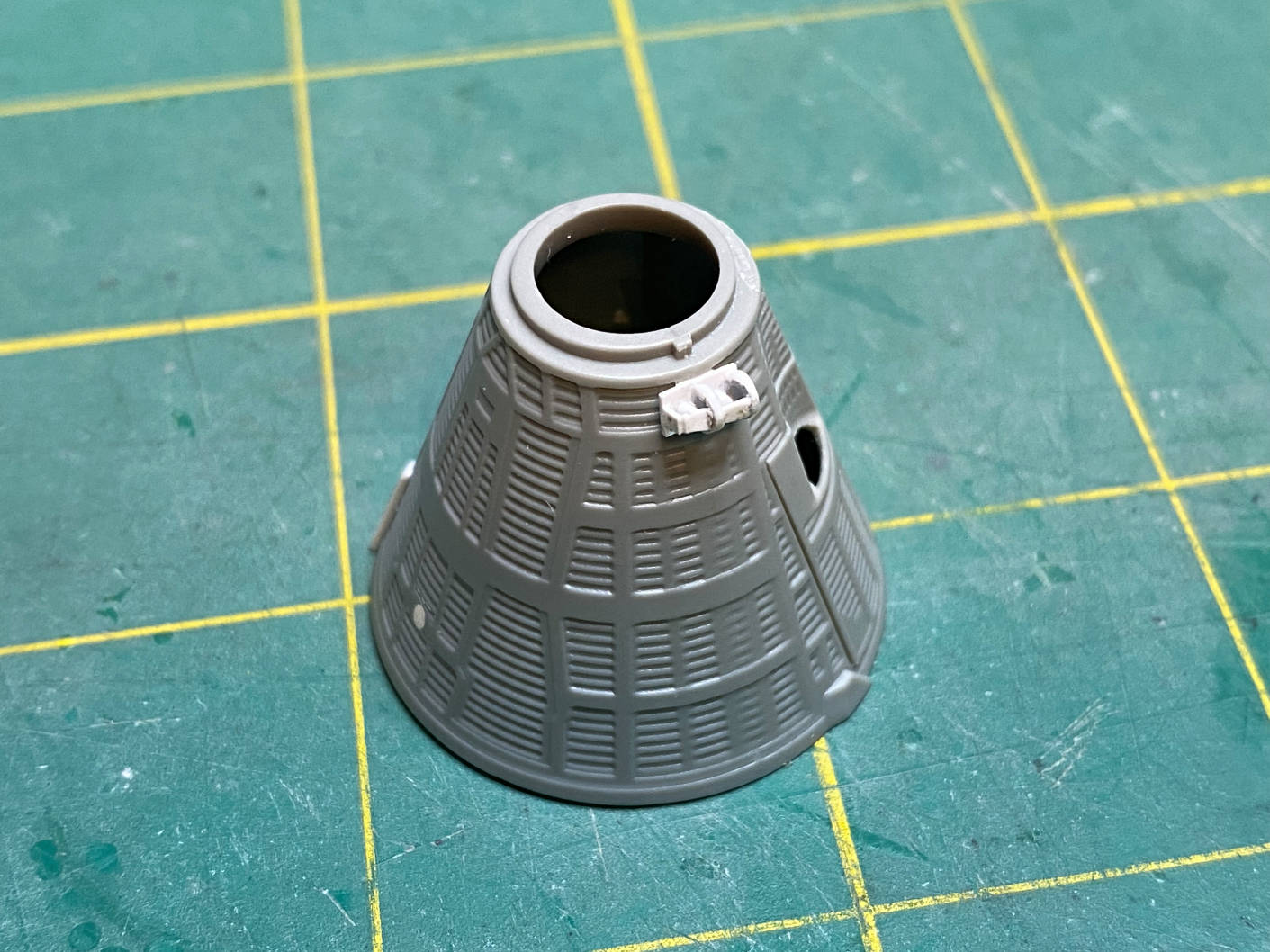 It is now attached to the crew section. I’ll put some Mr. Surfacer in the small gap between the ends and the capsule body.
