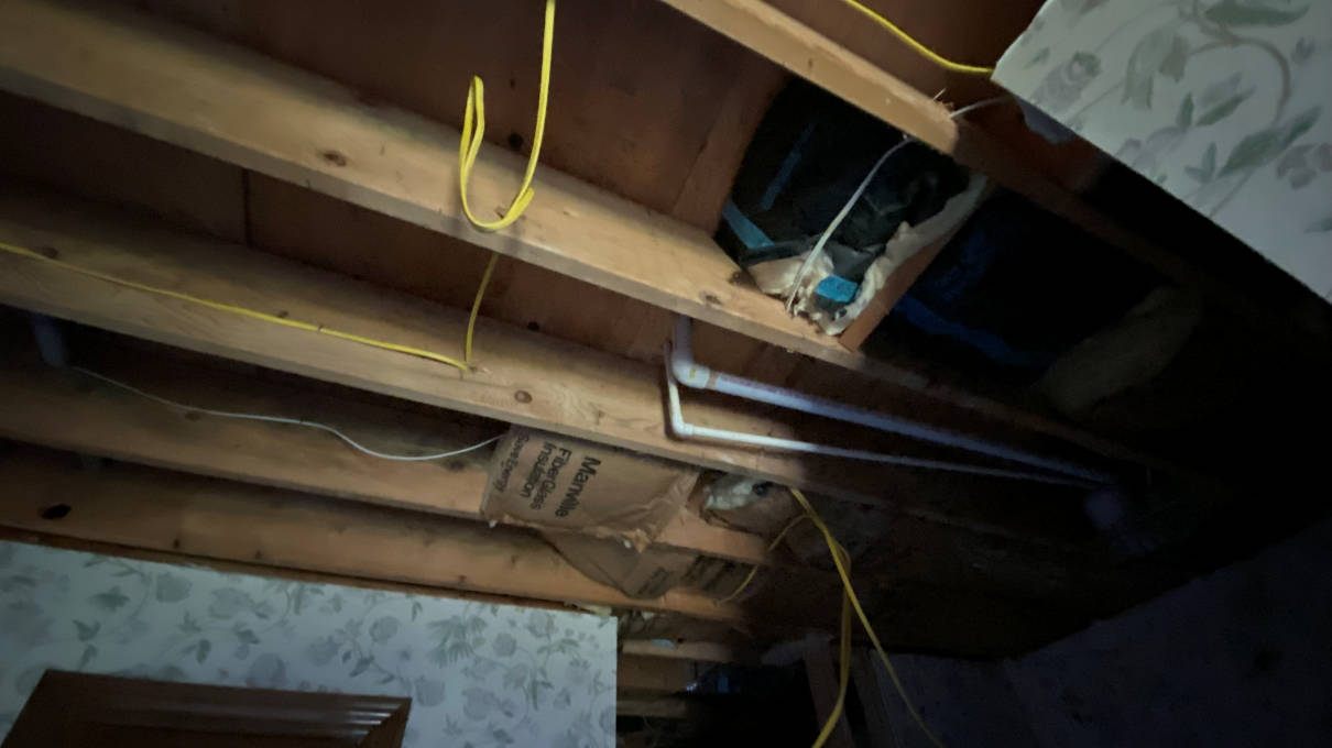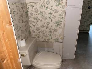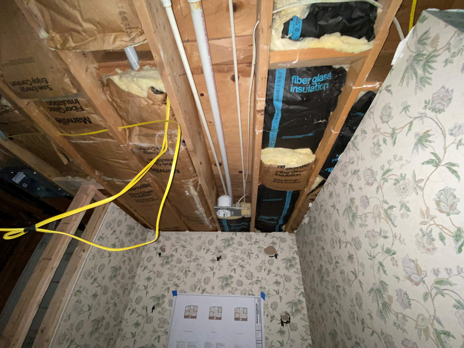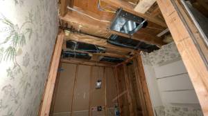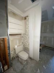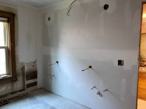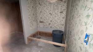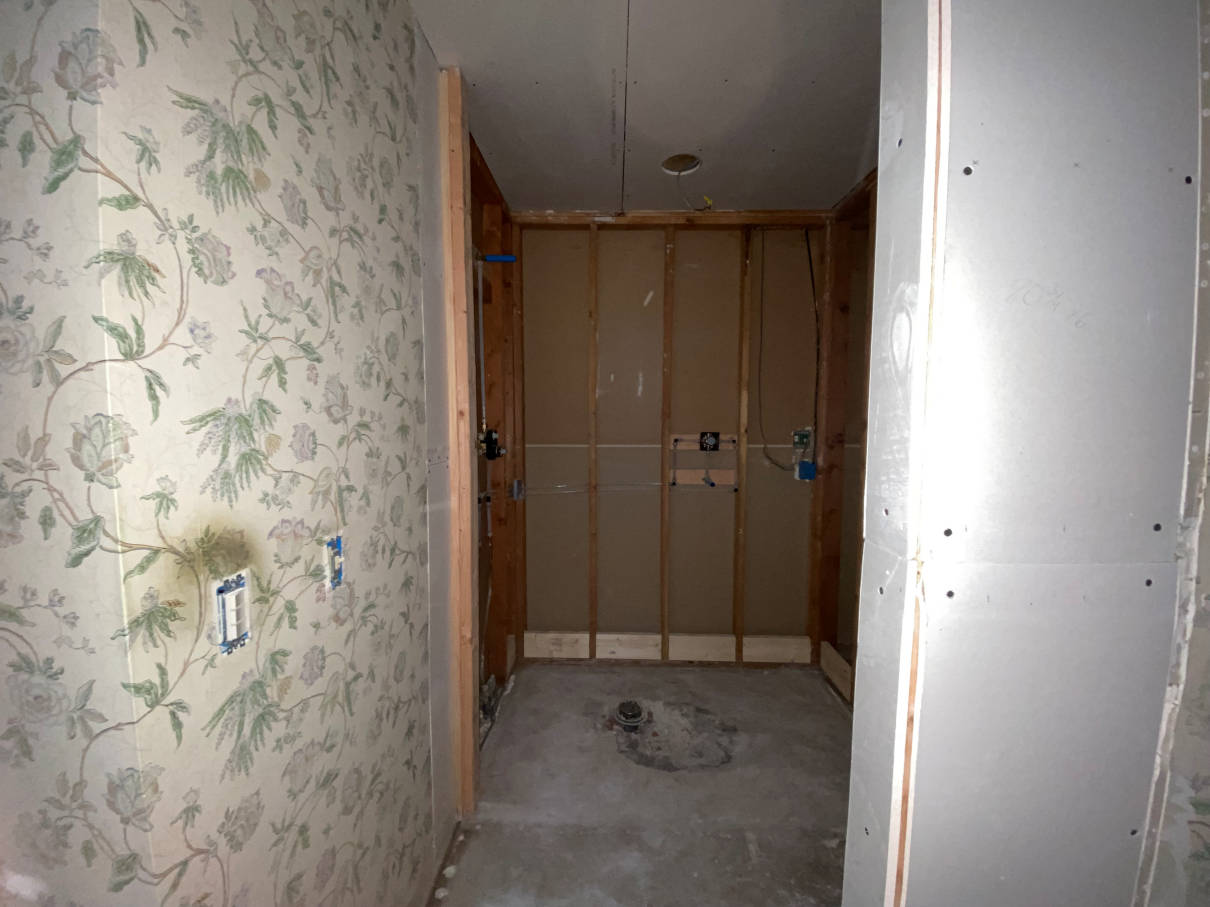 The sheetrock behind the vanity was removed as well to facilitate the changes to the plumbing and wiring. With the sheetrock out of the way the electrician was able to wire for the new outlets at the vanity. New can lights were going up in the ceiling, a new vent fan/light went in and a new can light over they shower. The plumber also came in to start preparing for the new sinks and make way for the tower cabinet that would be recessed into the wall.