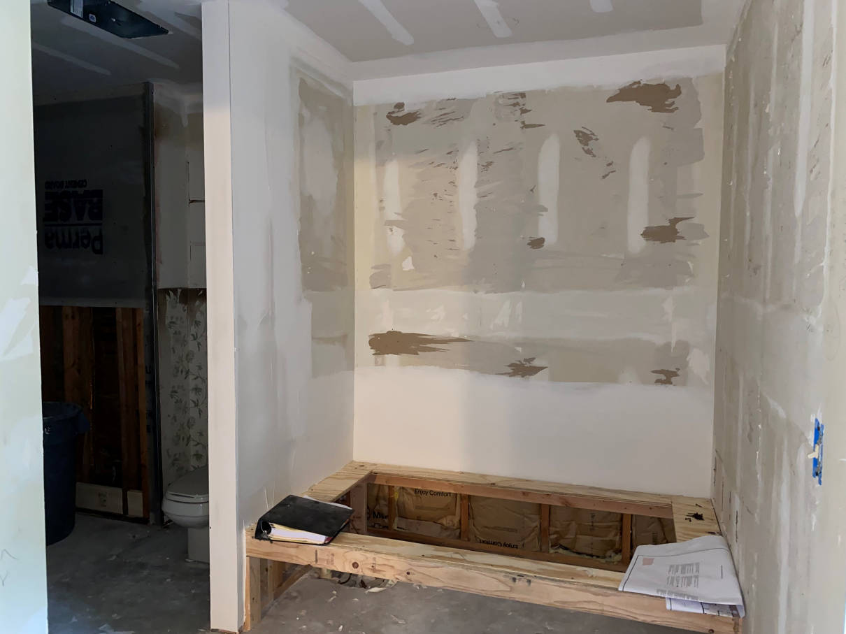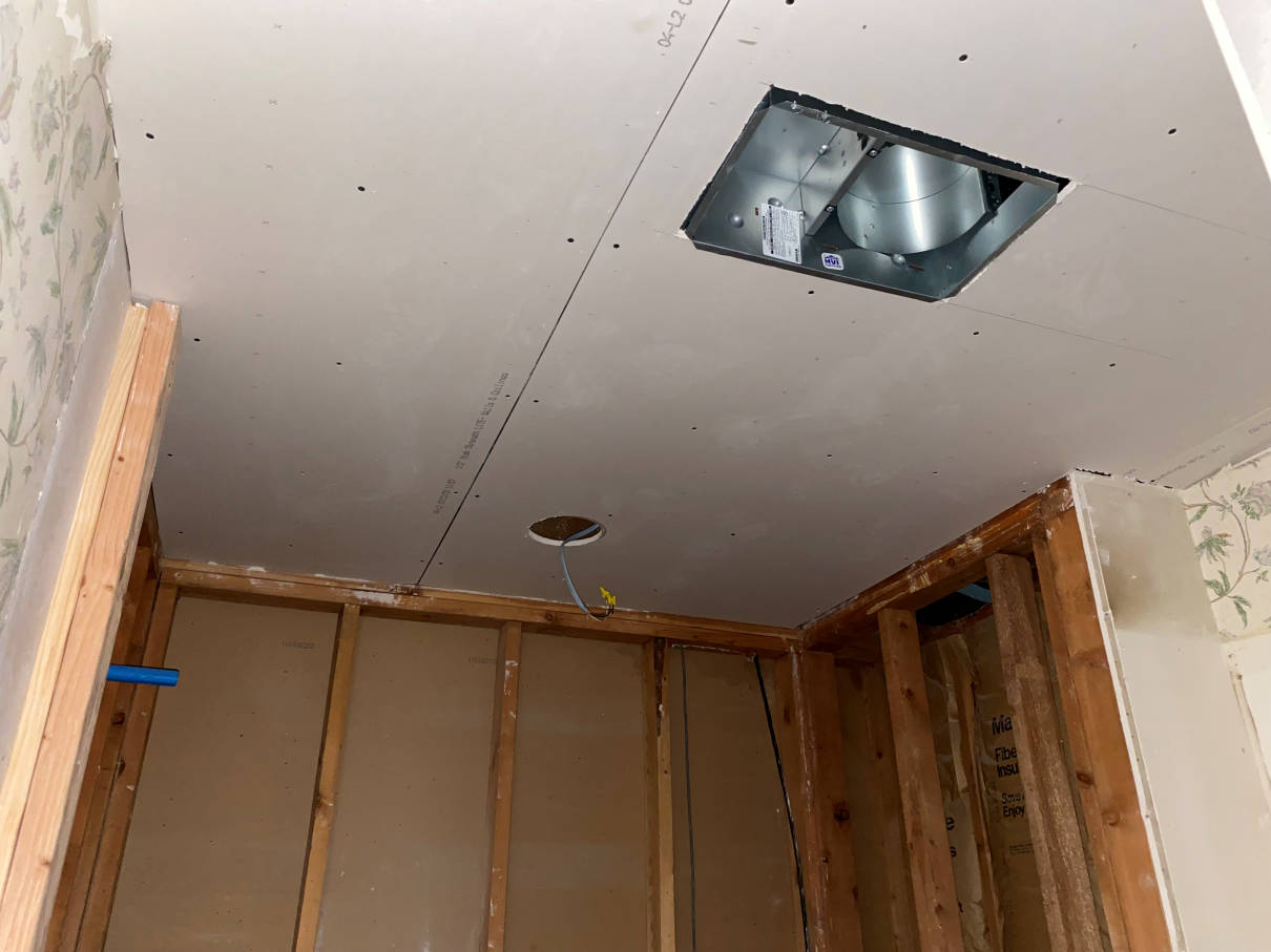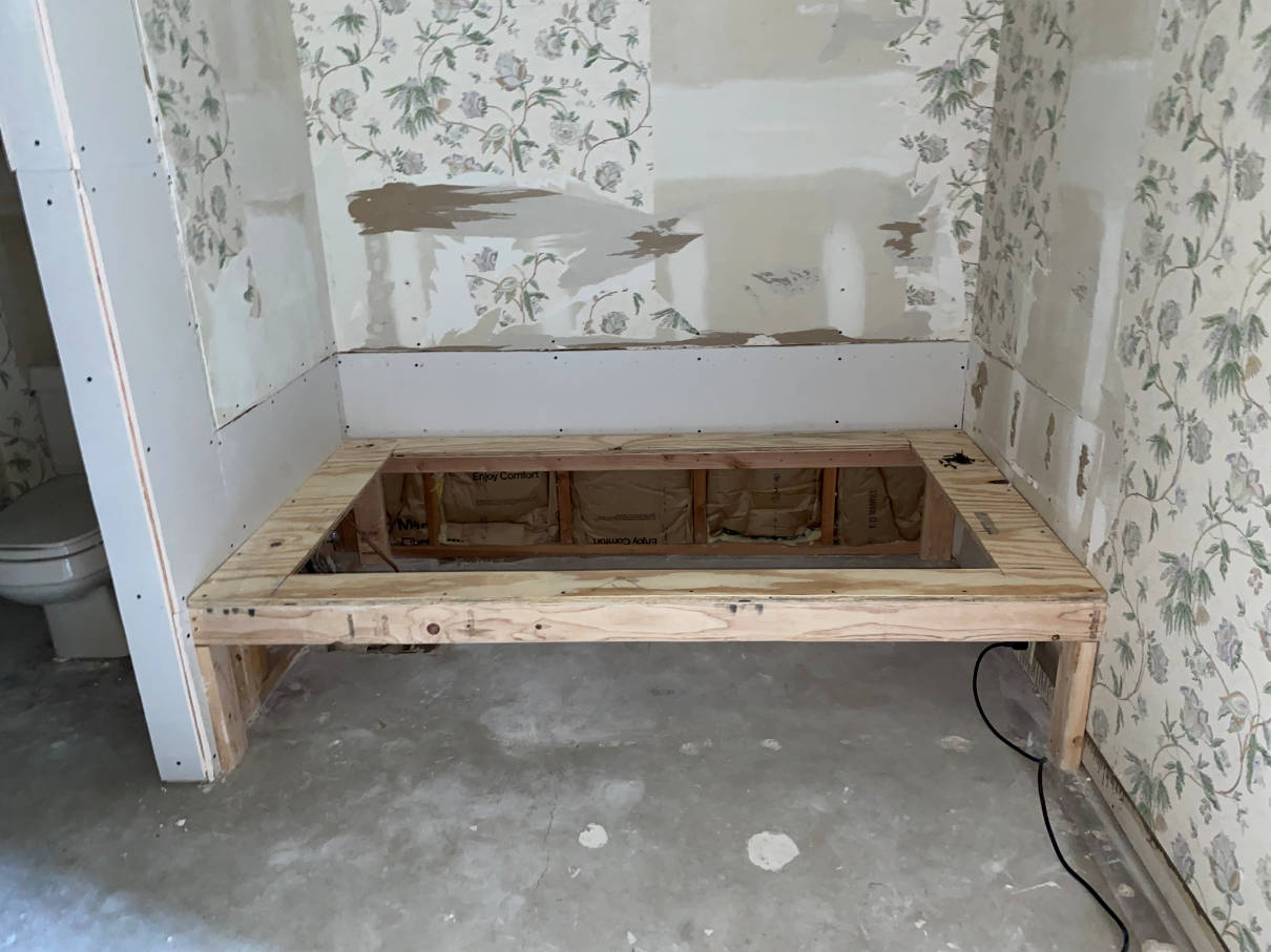 The next day new sheetrock started going up. The electrician came out briefly to get the remaining can light boxes put in. He also added the junction boxes for the two lights over the vanity. The extension to the toilet wall was added and the new tub frame started.