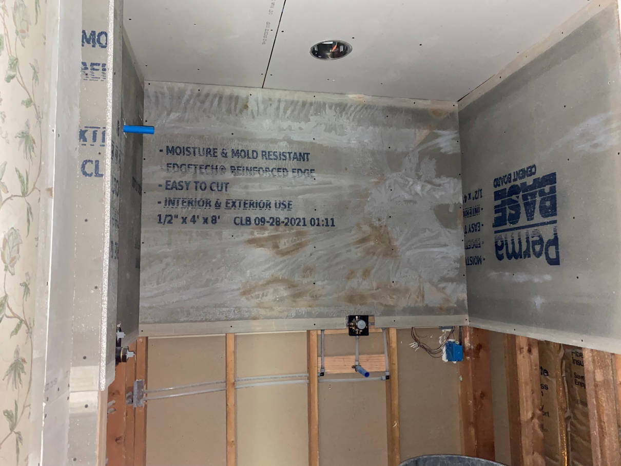 The next day mud work on the new sheetrock started. A small bit of sheetrock was put up at the new door frame and mudded in. A little more work was done to the tub frame and some cement board was put up in the shower.
