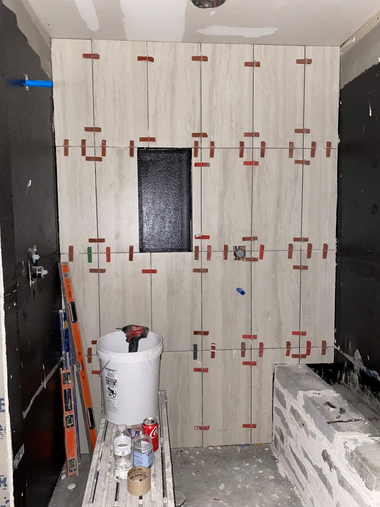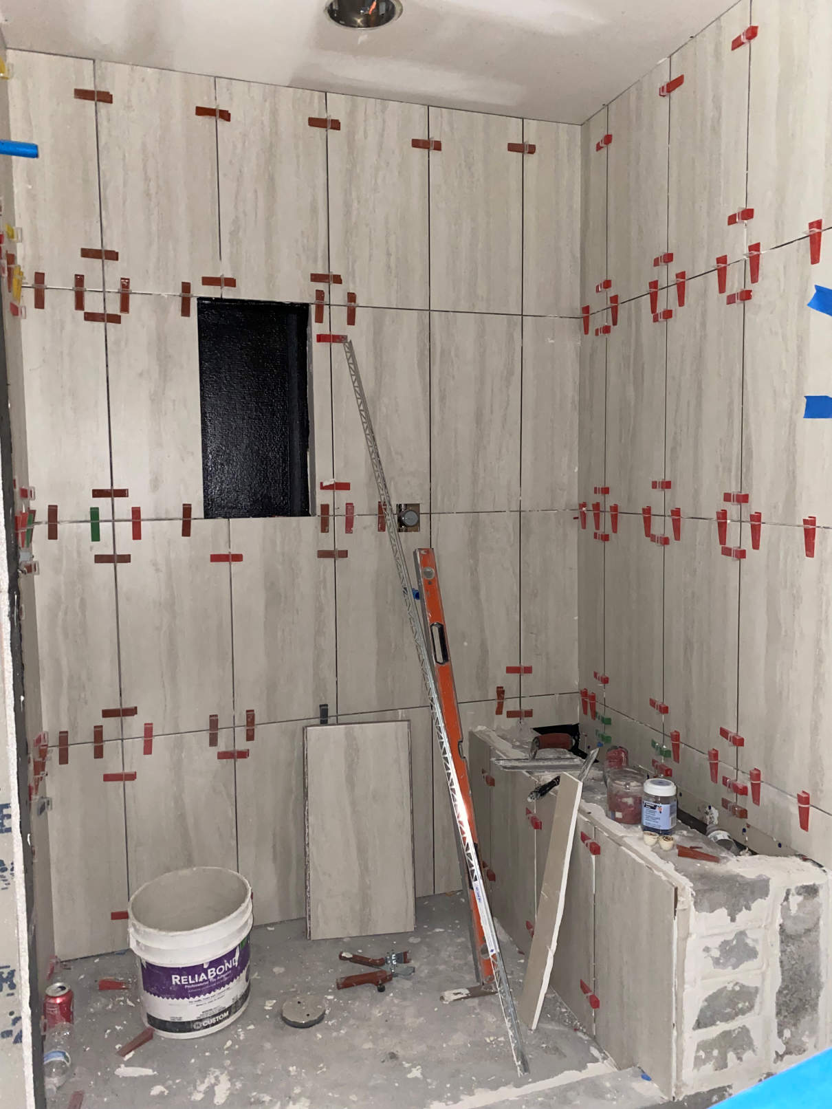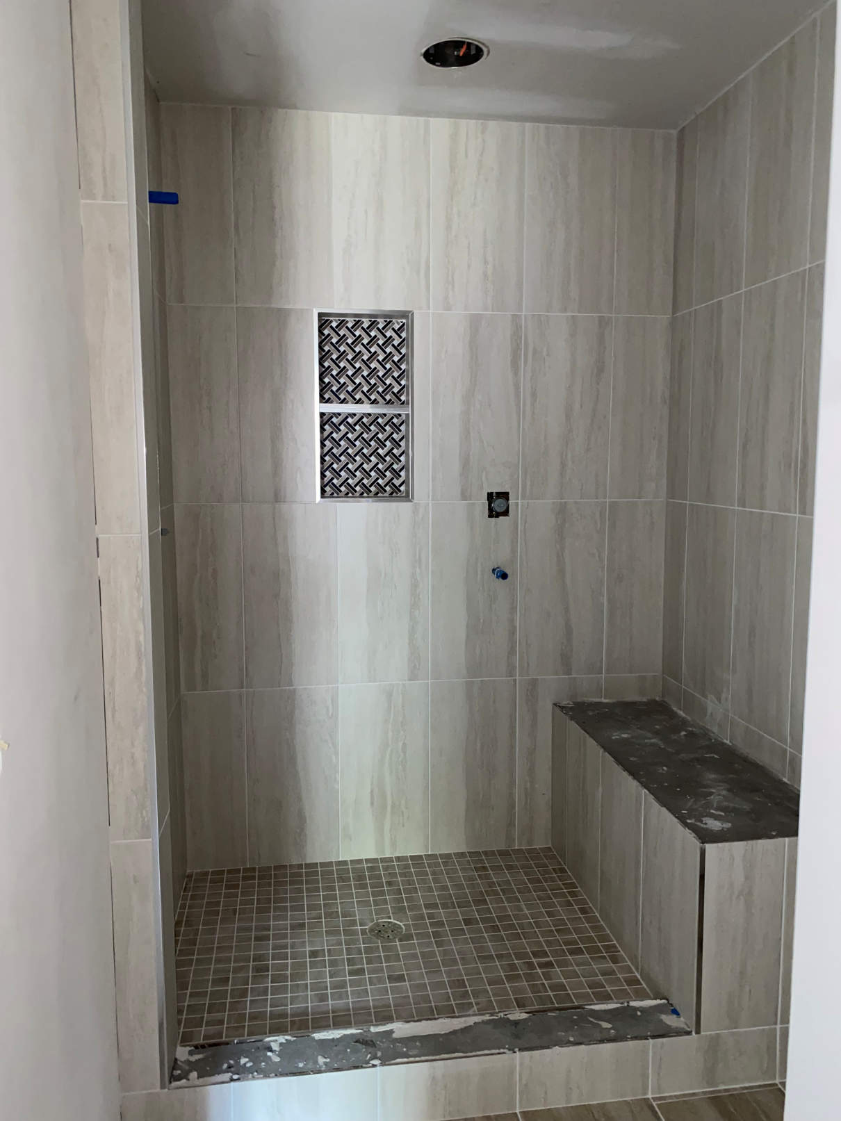 Later the concrete board was finished and the joints mudded. They also cut in for the shampoo cubby. The concrete board was waterproofed and the shower bench was was added. With that done, the shower wall tile was started.