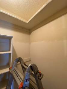 We are taking the down time to put sealer on all the grout lines in the new tile. We also are painting the closets. The only part of the closets that is in the build contract is the new carpet. Everything else is up to us. That kept costs down a little bit. Here is a group of photos showing the progress.