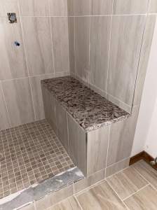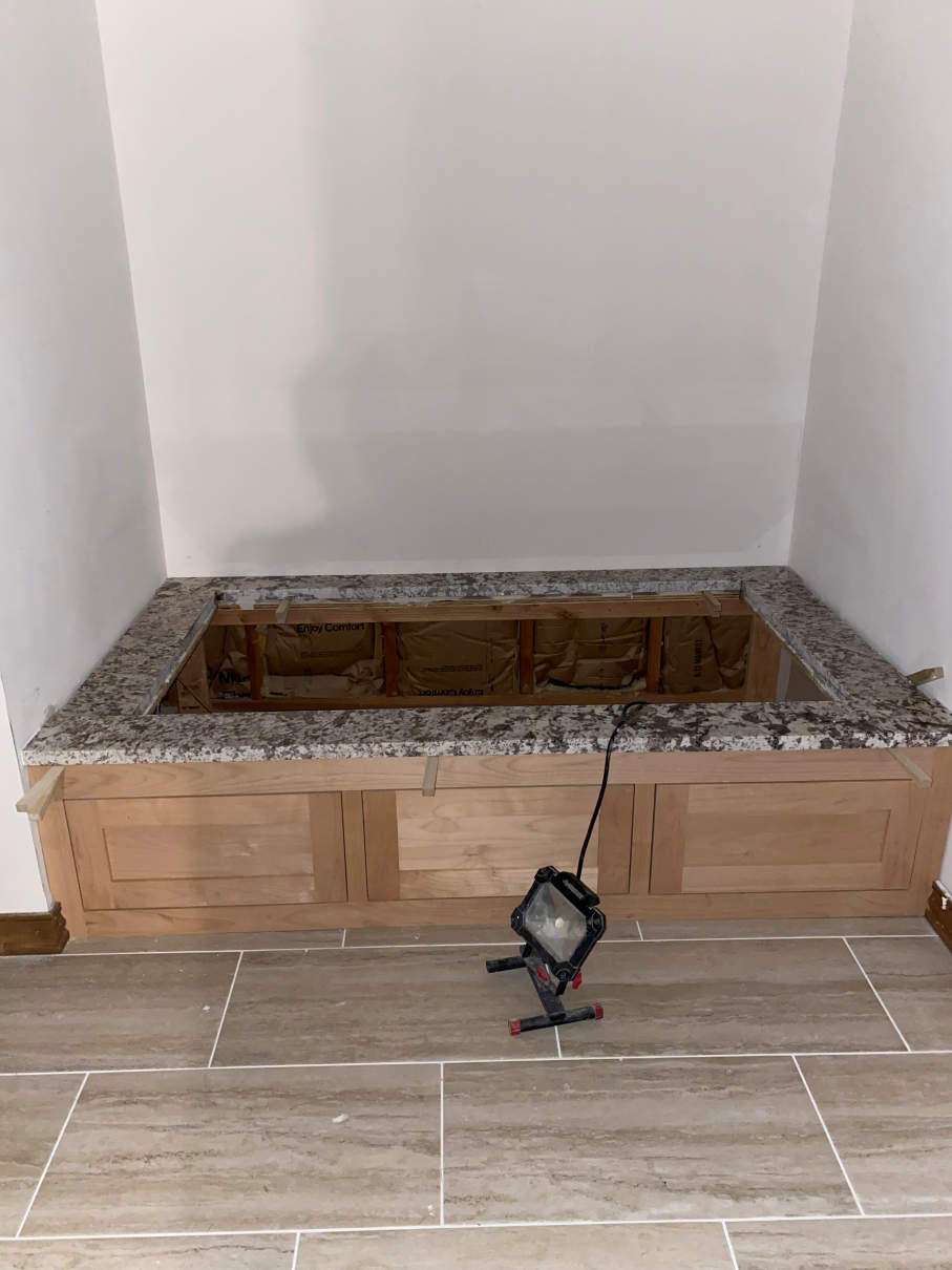 Note that the curb top is not installed. It was cut to the wrong size, they will bring out the correct one next week. The tub surround looks good, the backsplash for it will go in next week as well. Note the lack of a toilet. They disposed of it in the dumpster.